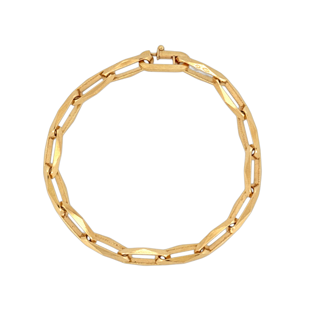 Deze 14 karaat geelgouden armband is voorzien van prachtig gefacetteerde details en heeft een robuust gesloten design. De armband is massief en van hoge kwaliteit, perfect om dagelijks te dragen. Draag deze armband op zichzelf voor een elegante look of combineer met andere armbanden voor een trendy en persoonlijke uitstraling. Een tijdloos stuk dat perfect is voor elke gelegenheid.