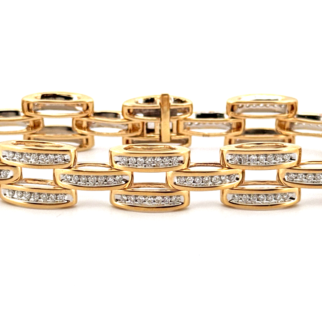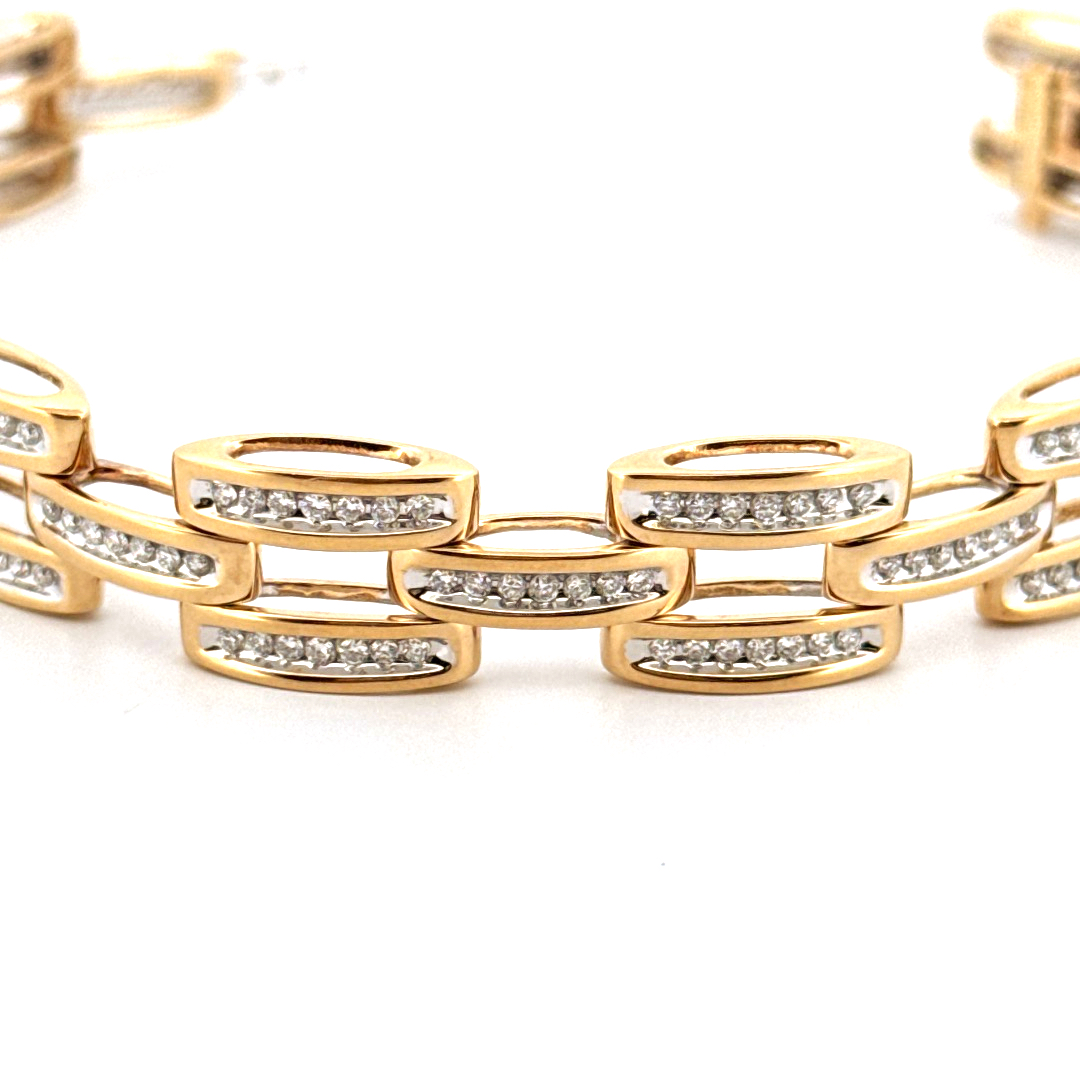 Deze prachtige armband is gemaakt van 14K geelgoud en is voorzien van schitterende briljanten. De open schakels geven de armband een elegante uitstraling. Het is perfect voor zowel casual als formele gelegenheden. Draag deze armband alleen voor een subtiele touch of combineer het met andere armbanden voor een trendy armparty look. Een tijdloos en veelzijdig sieraad voor elke vrouw.