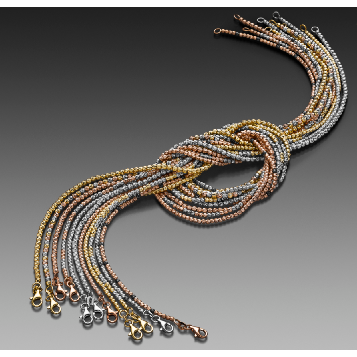 Deze prachtige armband van 14 karaats tricolor goud is versierd met gediamanteerde kraaltjes voor een subtiele sprankeling. Het delicate ontwerp maakt het perfect voor elke gelegenheid en kan zowel casual als chic gedragen worden. Combineer het met andere armbanden voor een trendy layered look of draag het alleen voor een verfijnde touch aan je outfit.