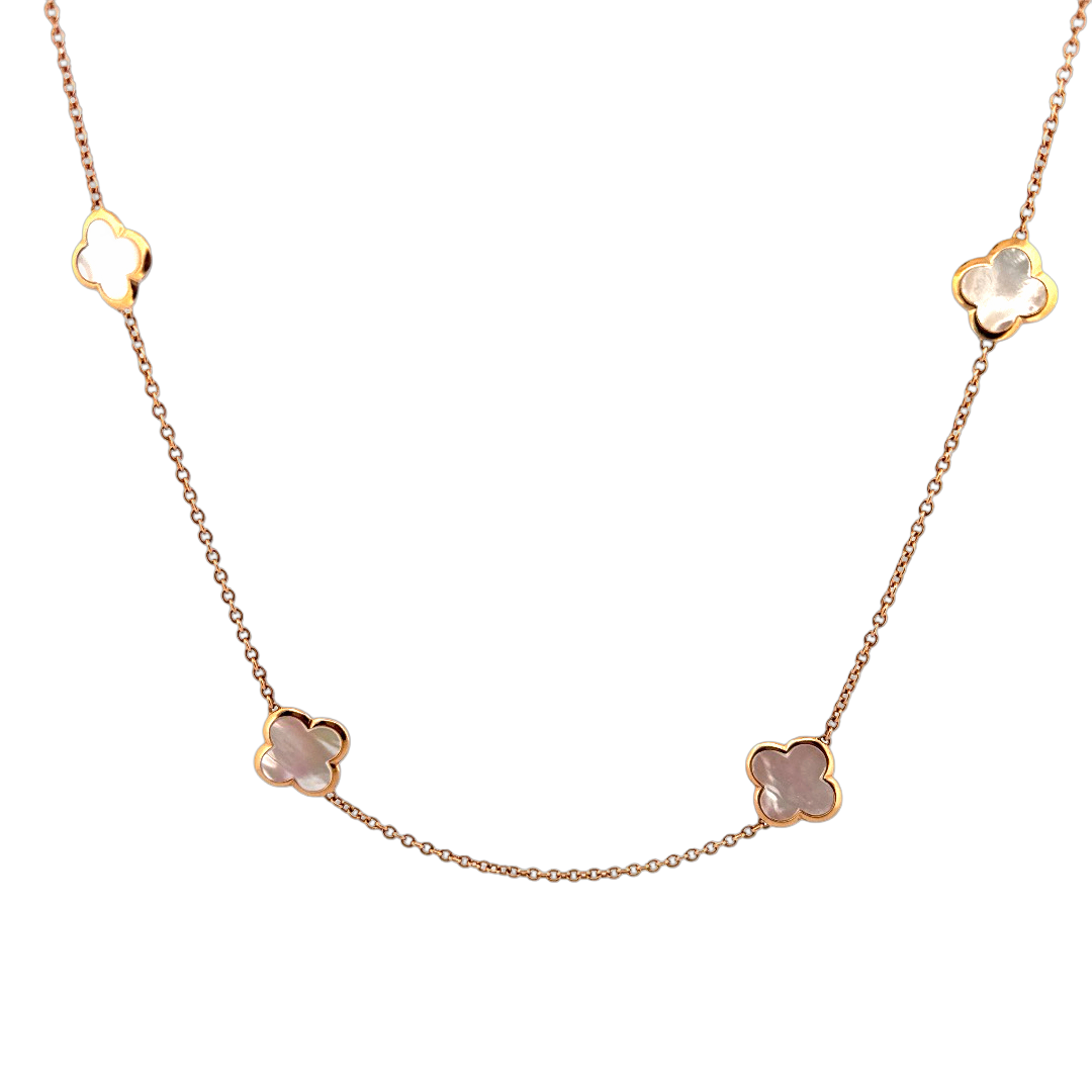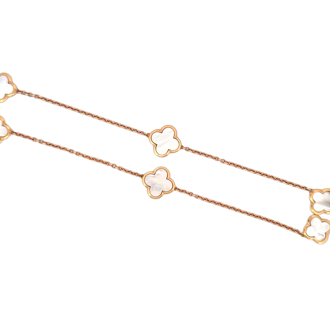 Dit prachtige 18 karaat roségouden Alhambra collier met 8 motieven en parelmoer details is 90 cm lang en kan dubbel gedragen worden voor een elegante look. De collier is voorzien van een tijdloos ontwerp dat perfect past bij elke outfit, van casual tot chic. Draag het bijvoorbeeld over een coltrui of naar een feestelijke gelegenheid voor een extra touch of glamour.