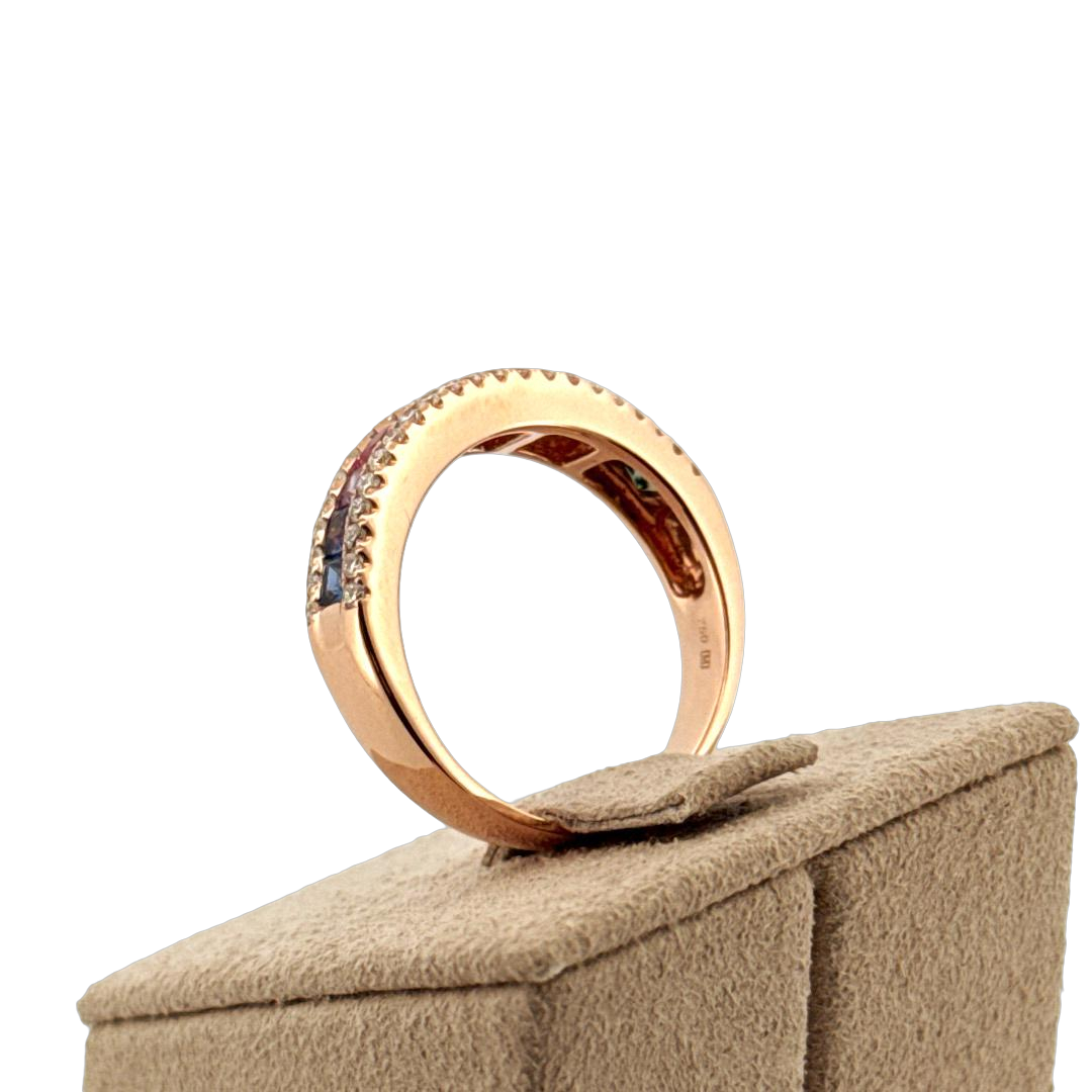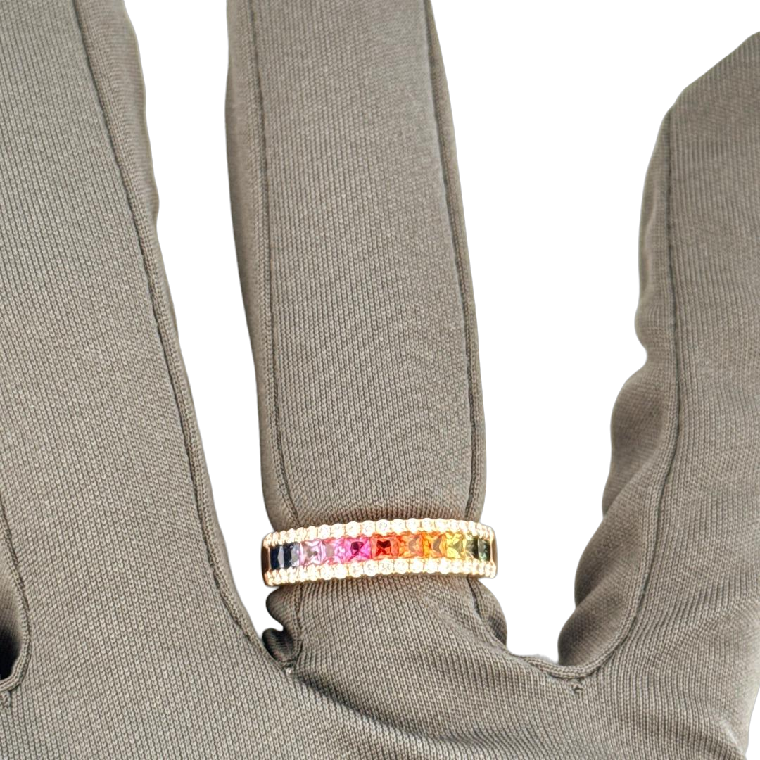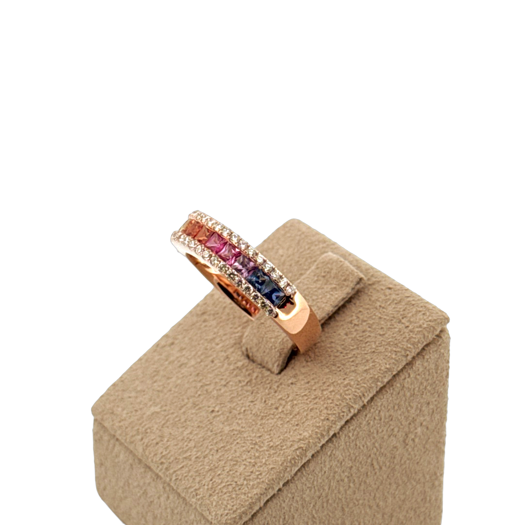 De 18krt Rose Gouden Regenboog Ring is een verfijnd sieraad met 18-karaats roségoud en prachtige saffieren van totaal 0,98 karaat en briljanten in SI1-puurheid en G-kleur. Met een elegante prinsessenslijpvorm, is de ring maat 55 perfect voor dagelijkse elegantie of speciale gelegenheden. Draag hem solo voor een verfijnde look of combineer met andere sieraden voor extra glamour.