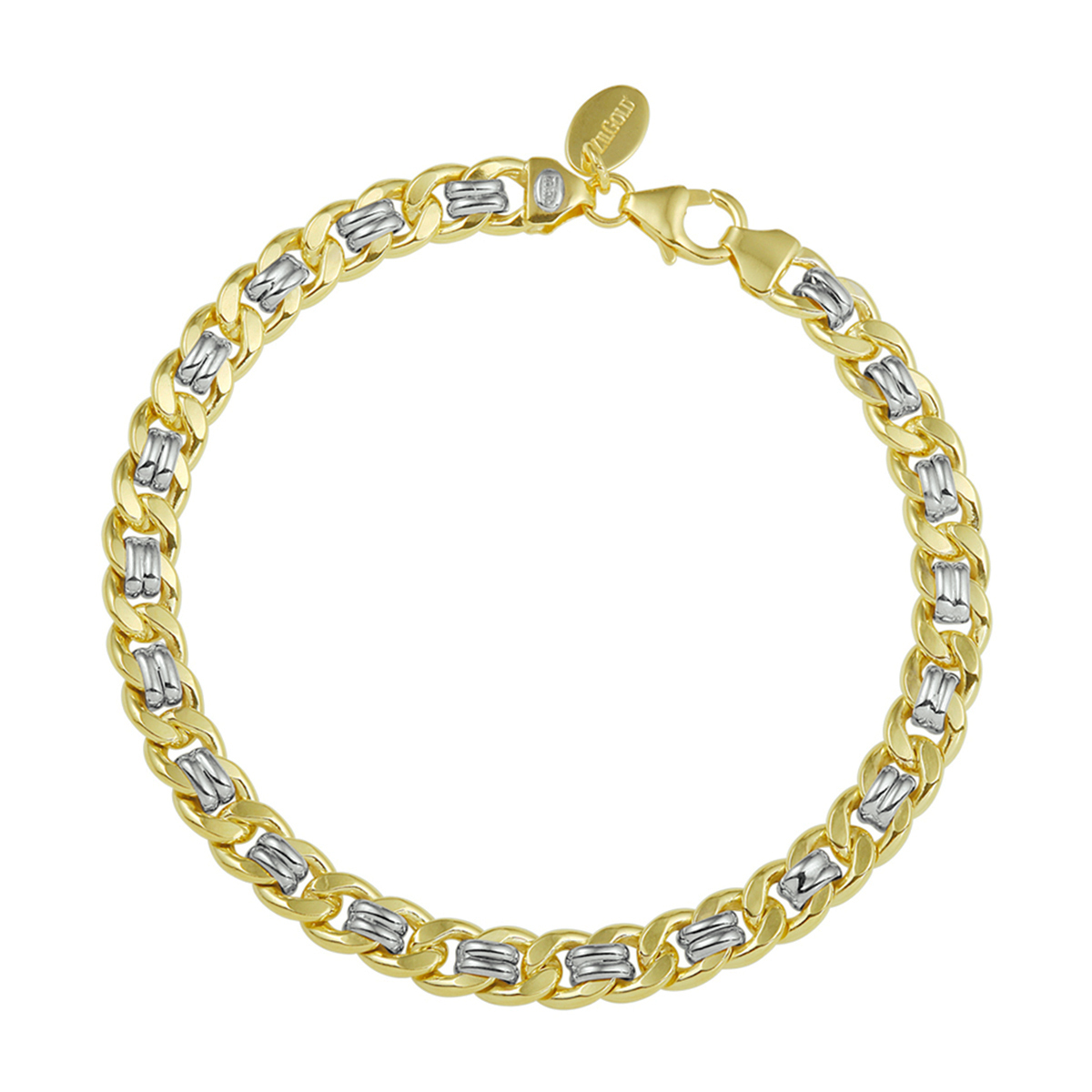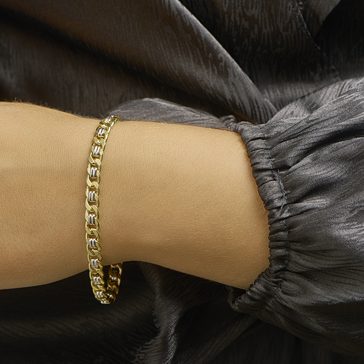 Sieraden van 14 karaat goud met daarin een kern van 925 zilver. Bicolor wit- en geelgouden armband met gourmet schakel.