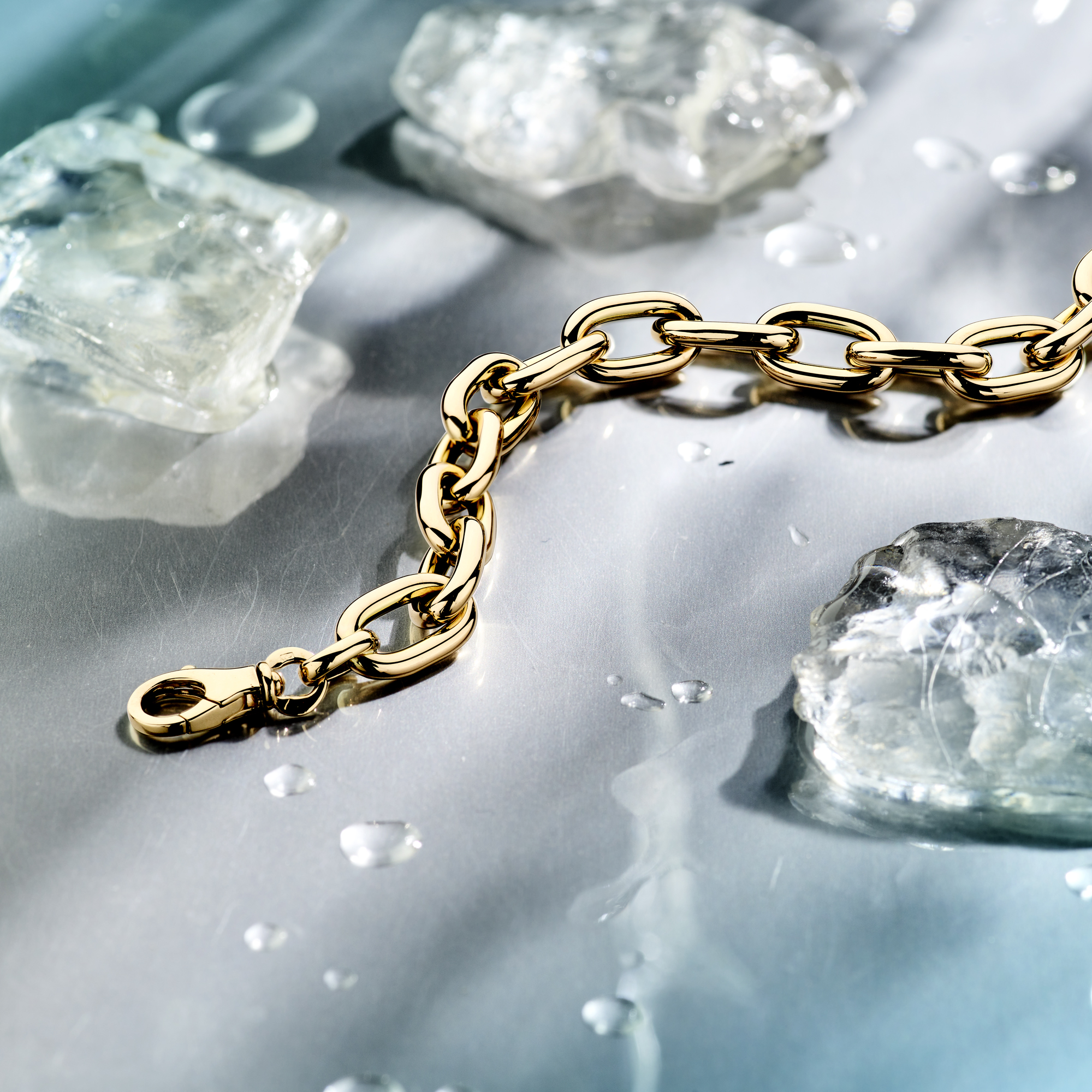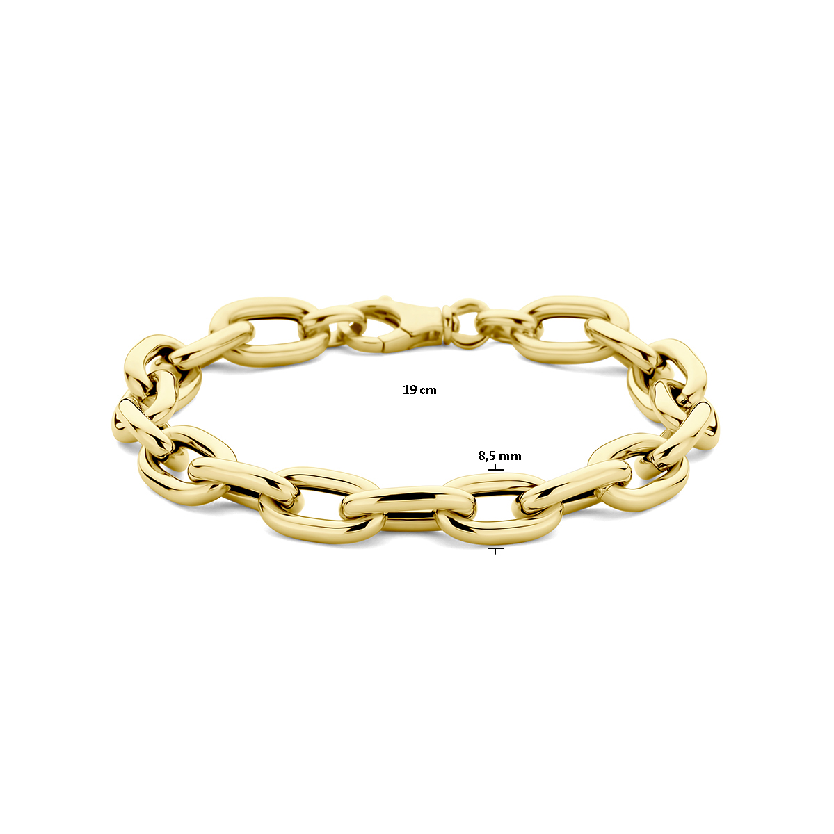 14k Geelgouden armband met een draaglengte van 19cm. De schakelbreedte is 8.5mm. Uitgevoerd met een karabijn sluiting.