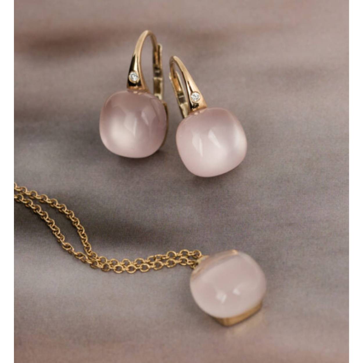 18 karaat rosé gouden oorhangers, Roze kwarts met parelmoer.