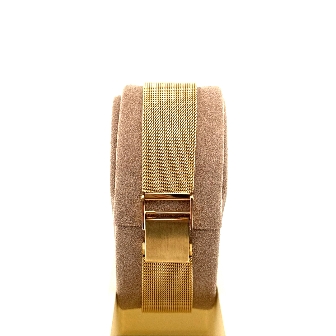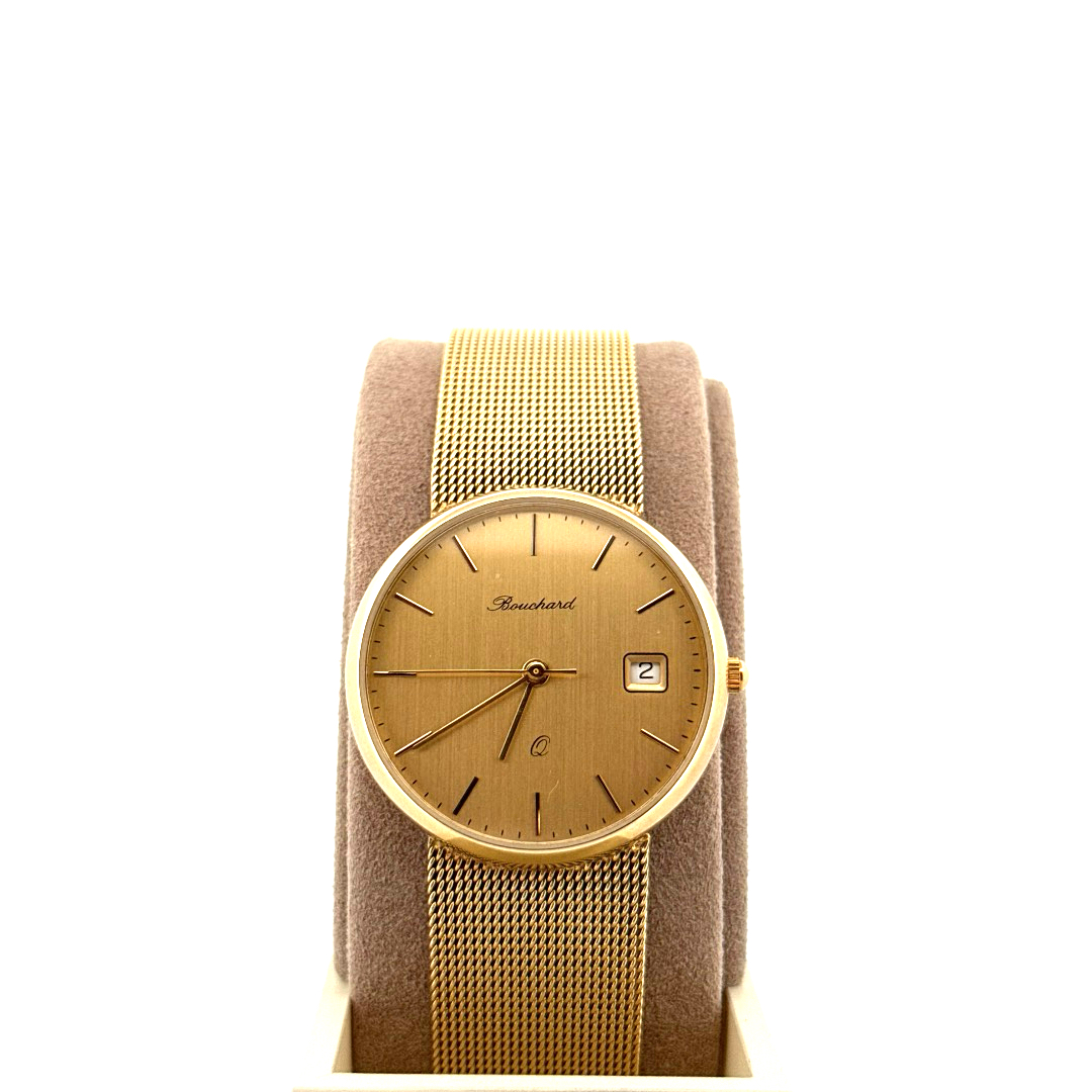 De Bouchard Genevé Horloge 14krt geelgoud 1063 29171 heeft een elegante ronde bezel, analoge wijzerplaat met gouden wijzer, en een Milanese mesh band van echt goud. Met Zwitserse quartz-beweging, datumaanduiding en krasbestendig kristalglas. Perfect voor formele gelegenheden en laat elke outfit stralen. Draag hem om je pols als een tijdloos stijlstatement. Nieuw en ongedragen.