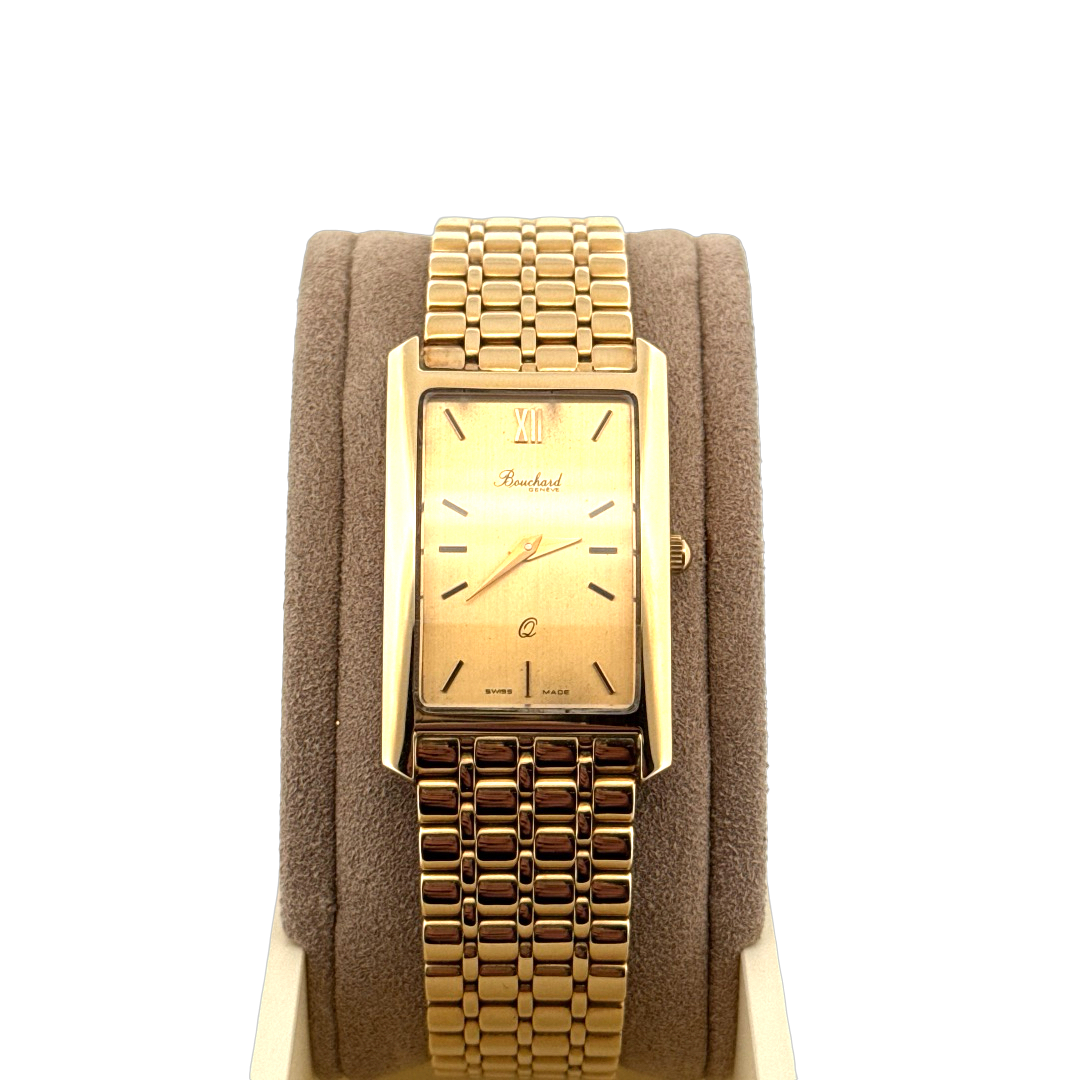 De Bouchard Genevé Horloge 14krt Geelgoud 11357140 is een elegante polshorloge met een rechthoekige kast van goud en een kristallen glas. De analoge wijzerplaat, uitgevoerd in goudkleur met streepindexen, straalt luxe uit. Voorzien van een Zwitsers quartz uurwerk en een gouden armband, perfect voor speciale gelegenheden wanneer u een statement wilt maken.