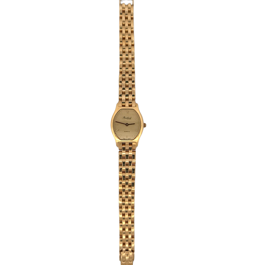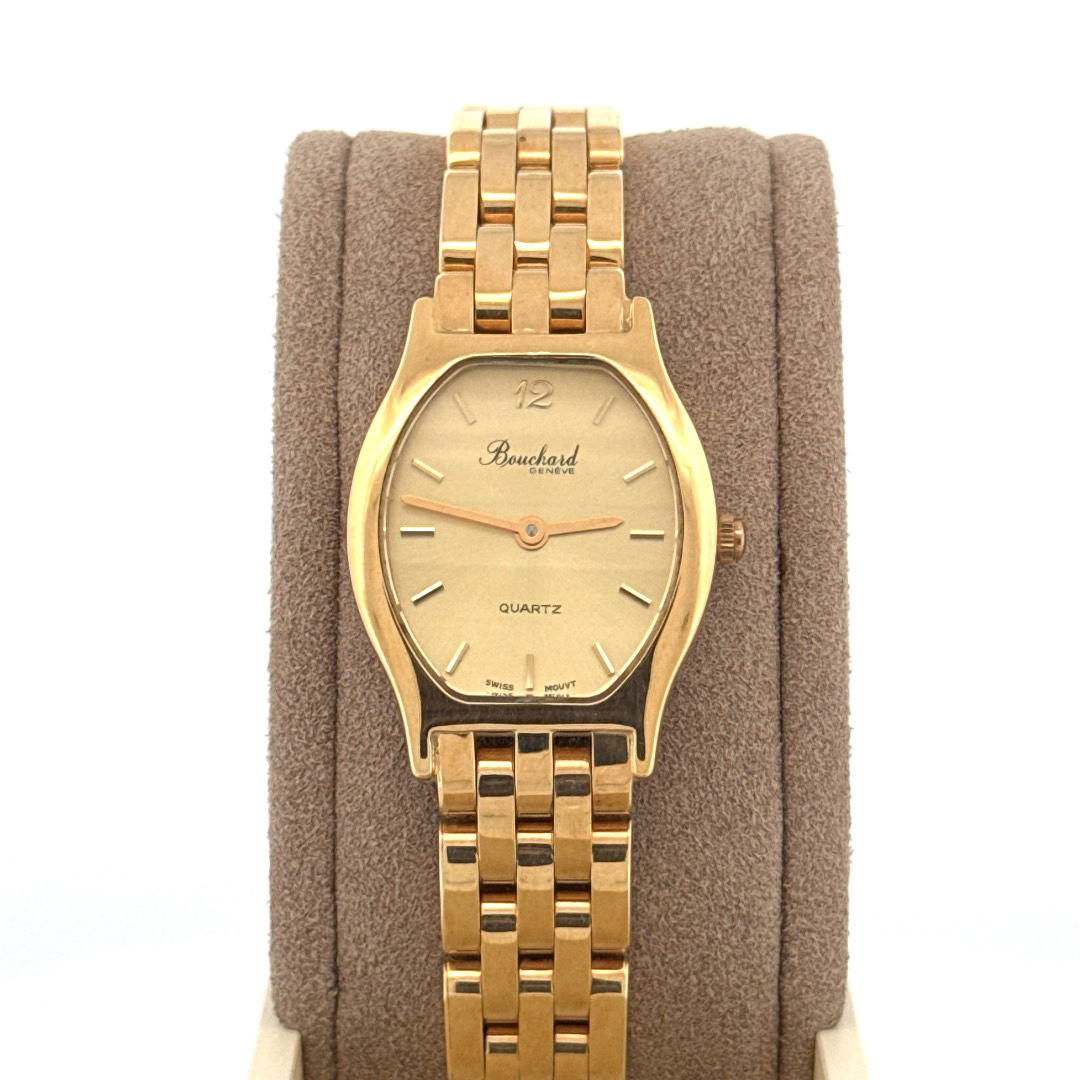 De Bouchard Horloge 11359391 is een elegante polshorloge met Zwitserse uurwerk, vervaardigd uit echt goud. De gouden horlogekast en -band stralen luxe uit. Zonder datumfunctie. Perfect voor speciale gelegenheden of dagelijks gebruik, om een verfijnde touch toe te voegen aan elke outfit. Draag met formele of chique casual kleding voor een tijdloze uitstraling.