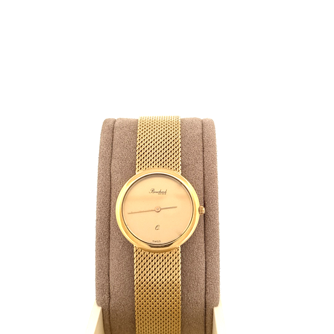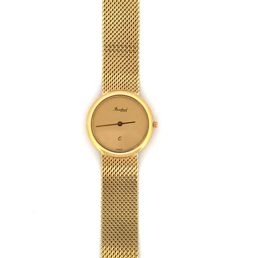 Dit product, de Bouchard Horloge 14krt Geelgoud 1135220, is een luxe polshorloge met een kast van goud en saffierglas. Het heeft een analoge weergave en Zwitserse quartzbeweging. De goudgekleurde band is van echt goud. Zonder datumaanduiding is dit elegante horloge perfect voor formele gelegenheden. Draag het met gepaste klederdracht voor een verfijnde uitstraling.