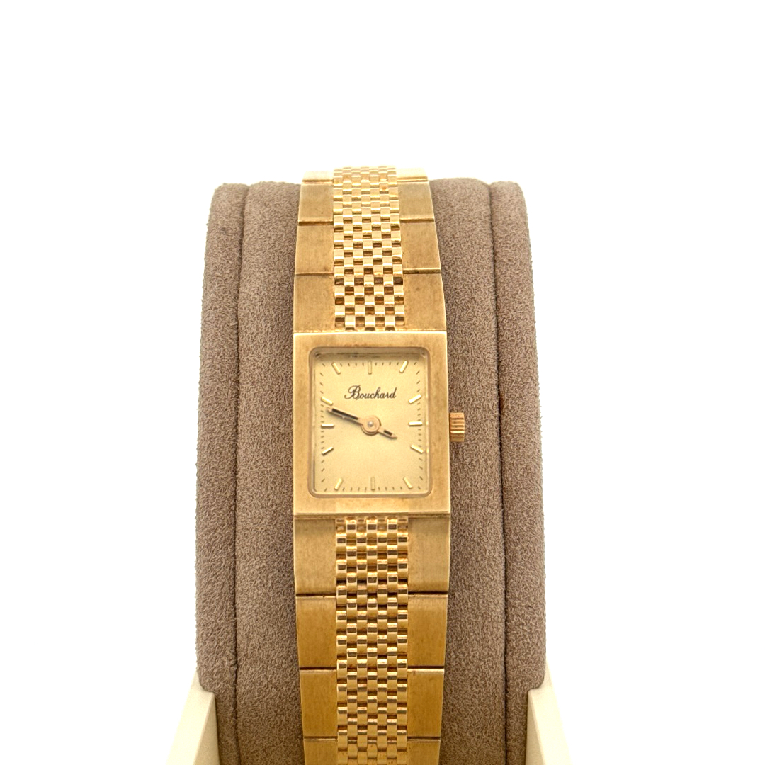 De Bouchard Horloge 14krt Geelgoud 1135308 is een elegante polshorloge met een rechthoekige gouden kast en saffierglas. Het horloge heeft een analoge tijdsaanduiding en een quartz uurwerk met Zwitserse precisie. De gouden wijzerplaat met streepjesindexen maakt het ontwerp compleet. Draag dit luxe horloge bij formele gelegenheden voor een verfijnde en stijlvolle uitstraling.
