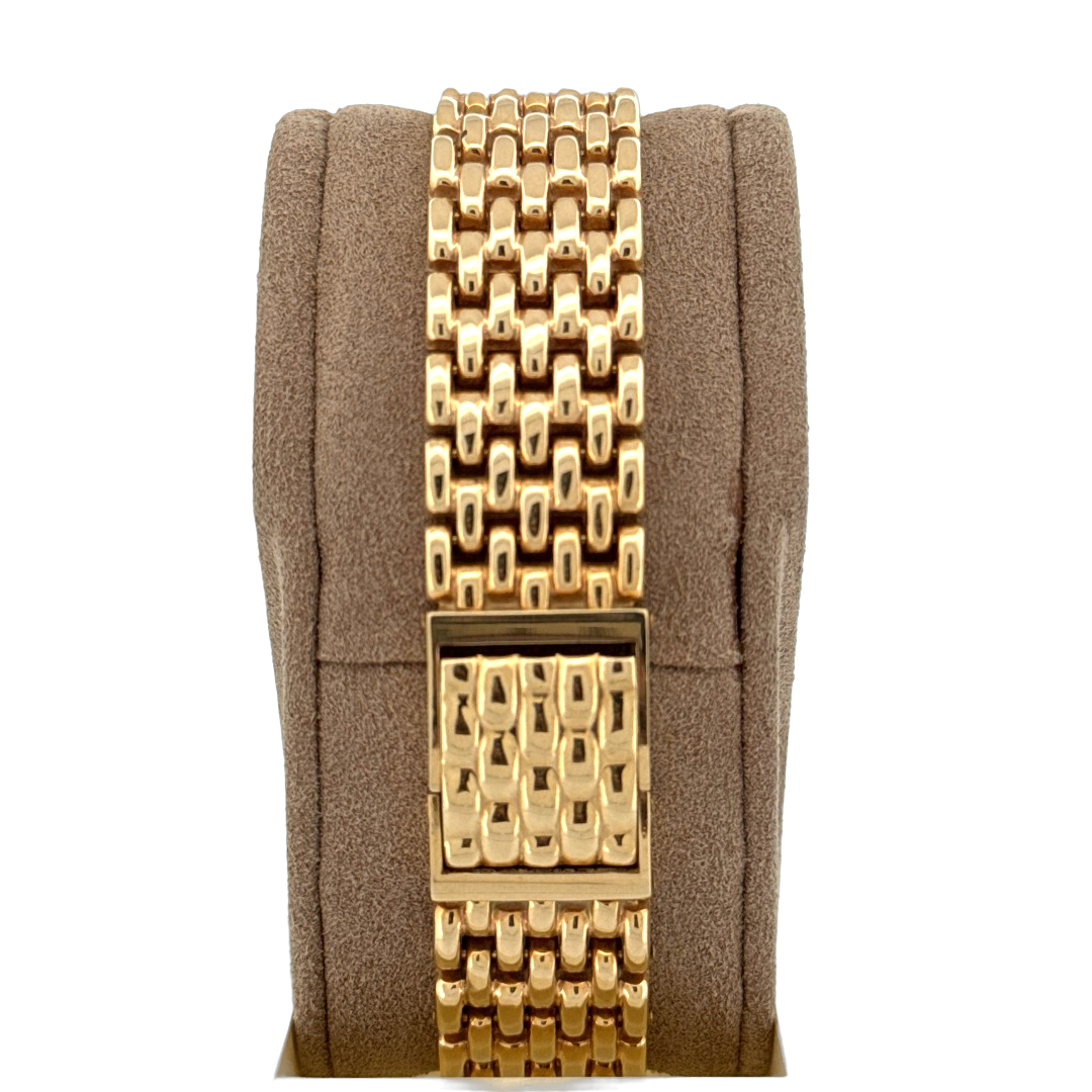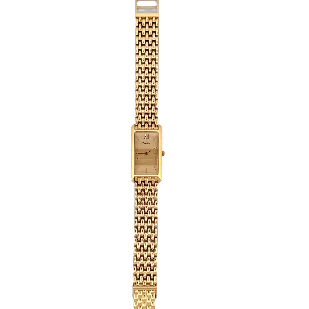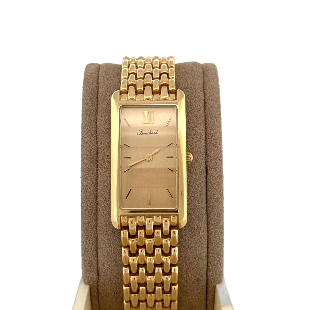 De Bouchard Horloge 14krt Geelgoud 11357054 is een luxe, Zwitserse horloge met een goudkleurige analoge wijzerplaat en streepindex. Uitgerust met een saffierglas, een rechthoekige gouden kast en een Milanese mesh band van echt goud. Draag deze elegante polshorloge bij formele gelegenheden of zakelijke outfits voor een verfijnde uitstraling.