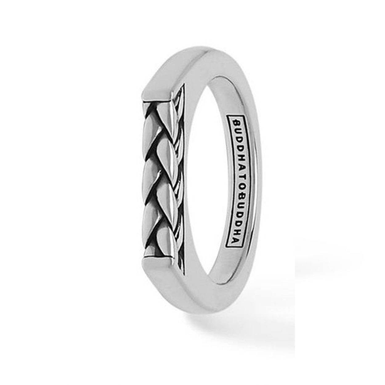 Zilveren smalle Buddha To Buddha ring gemaakt van echt zilver. Deze Buddha 054 Tangguh Signet George ring heeft een gevlochten design met een platte bovenkant.  Het logo zit ook aan de binnenzijde.
