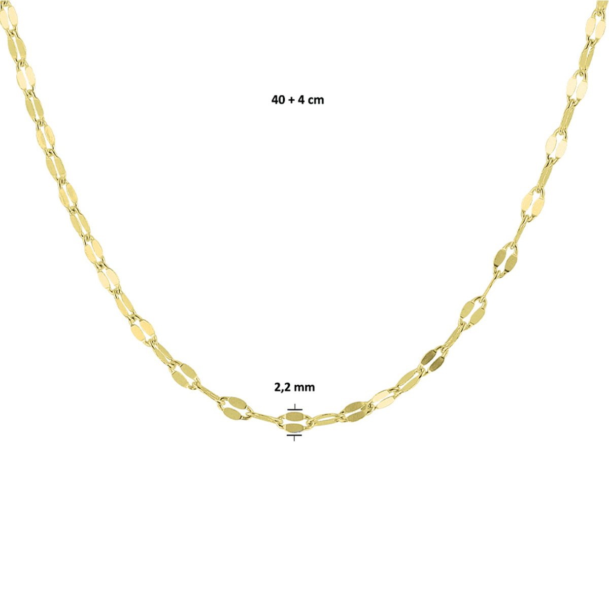 Geelgoud op zilveren collier uitgevoerd met een stevige karabijn sluiting. Het collier heeft een schakelbreedte van 2.2mm. Door het simplistische design gemakkelijk te combineren met andere geelgoud op zilveren sieraden. Geen garantie op plating.