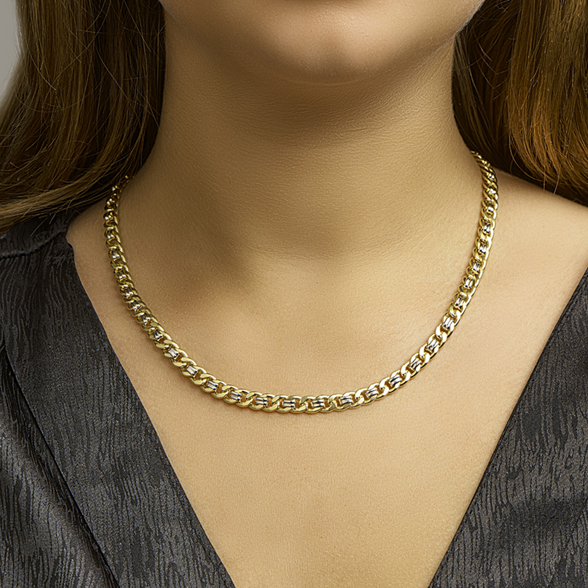 Beschrijving: Sieraden van 14 karaat goud met daarin een kern van 925 zilver. Bicolor wit- en geelgouden collier met gourmet schakel.