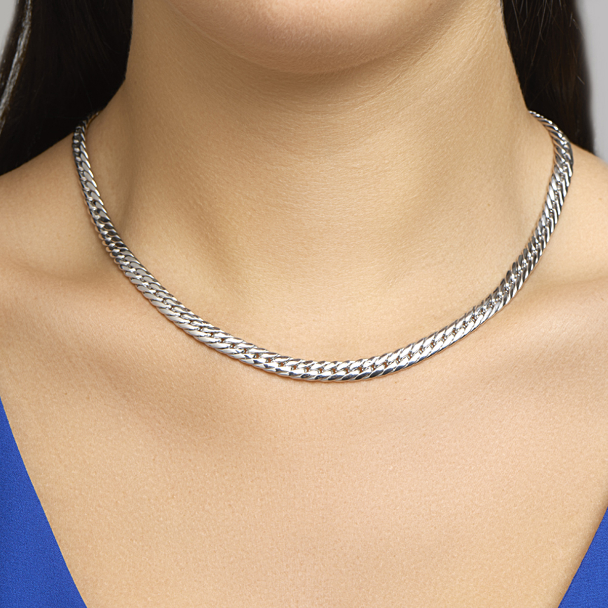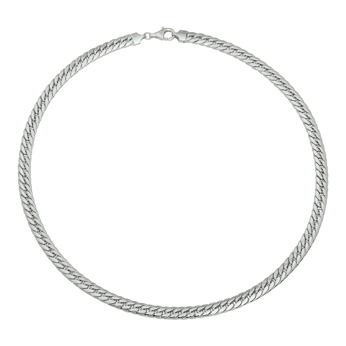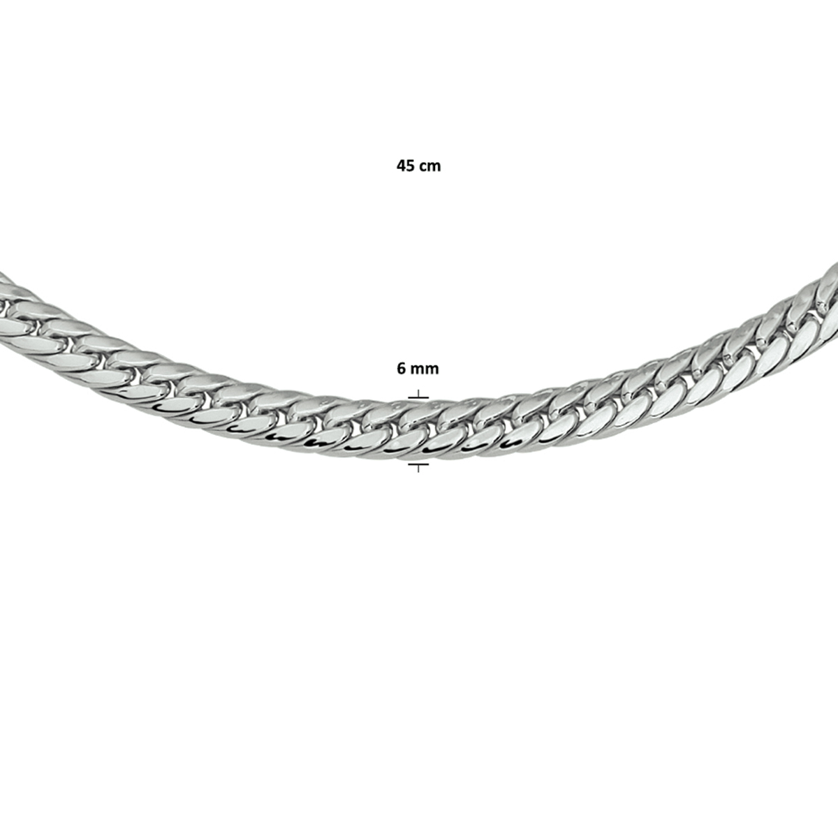 Beschrijving: Stijlvol gerhodineerd zilveren collier met een gourmet schakel. Het collier heeft een schakelbreedte van 6mm en een draaglengte van 45cm. Uitgevoerd met een stevige karabijn sluiting. Info: Gerhodineerd zilver is door de rhodiumlaag beter bestand tegen verkleuren en krassen.