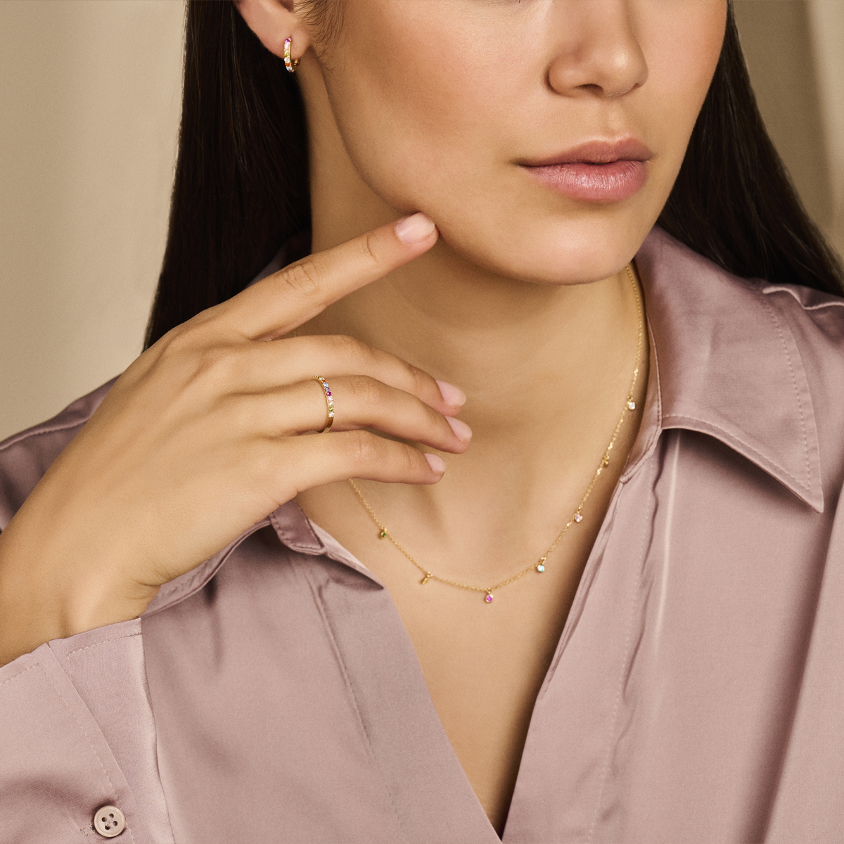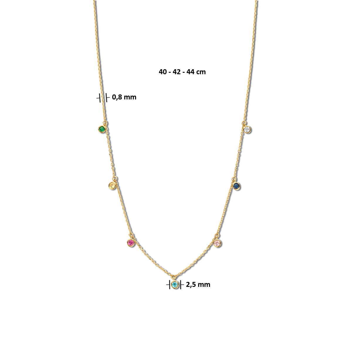 14k Geelgouden collier met gekleurde zirkonia stenen. Het collier heeft een draaglengte van 44cm.