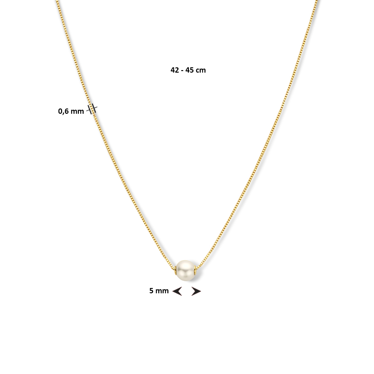 14k Geelgouden collier uitgevoerd met een schitterende zoetwaterparel. Het collier heeft draaglengtes van 42 en 45cm. De parel heeft een diameter van 5mm.