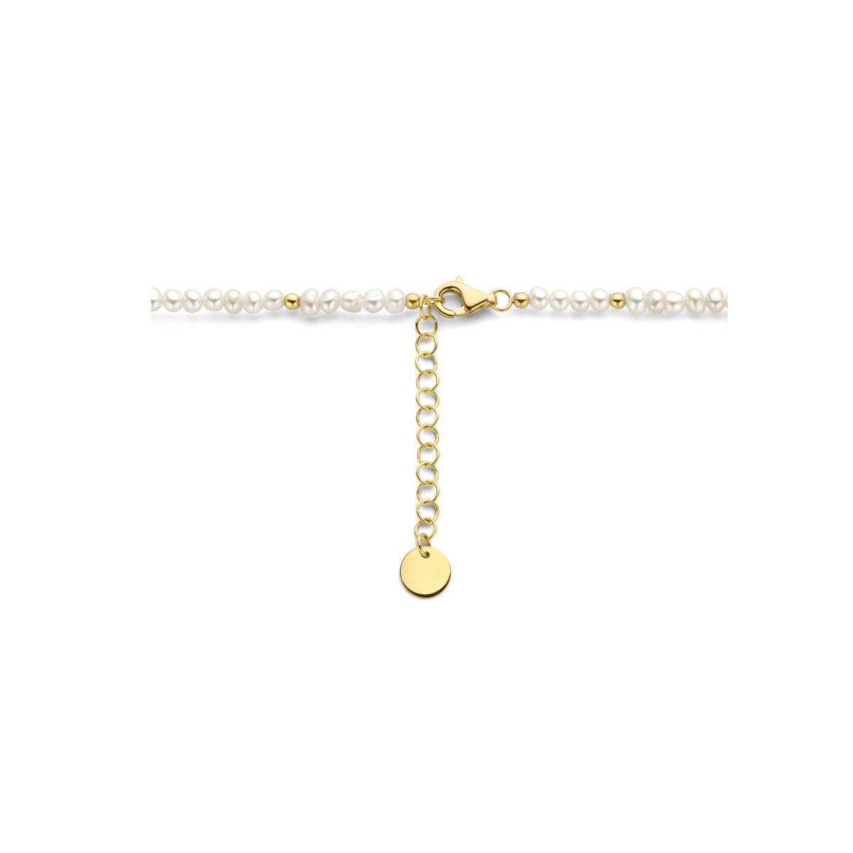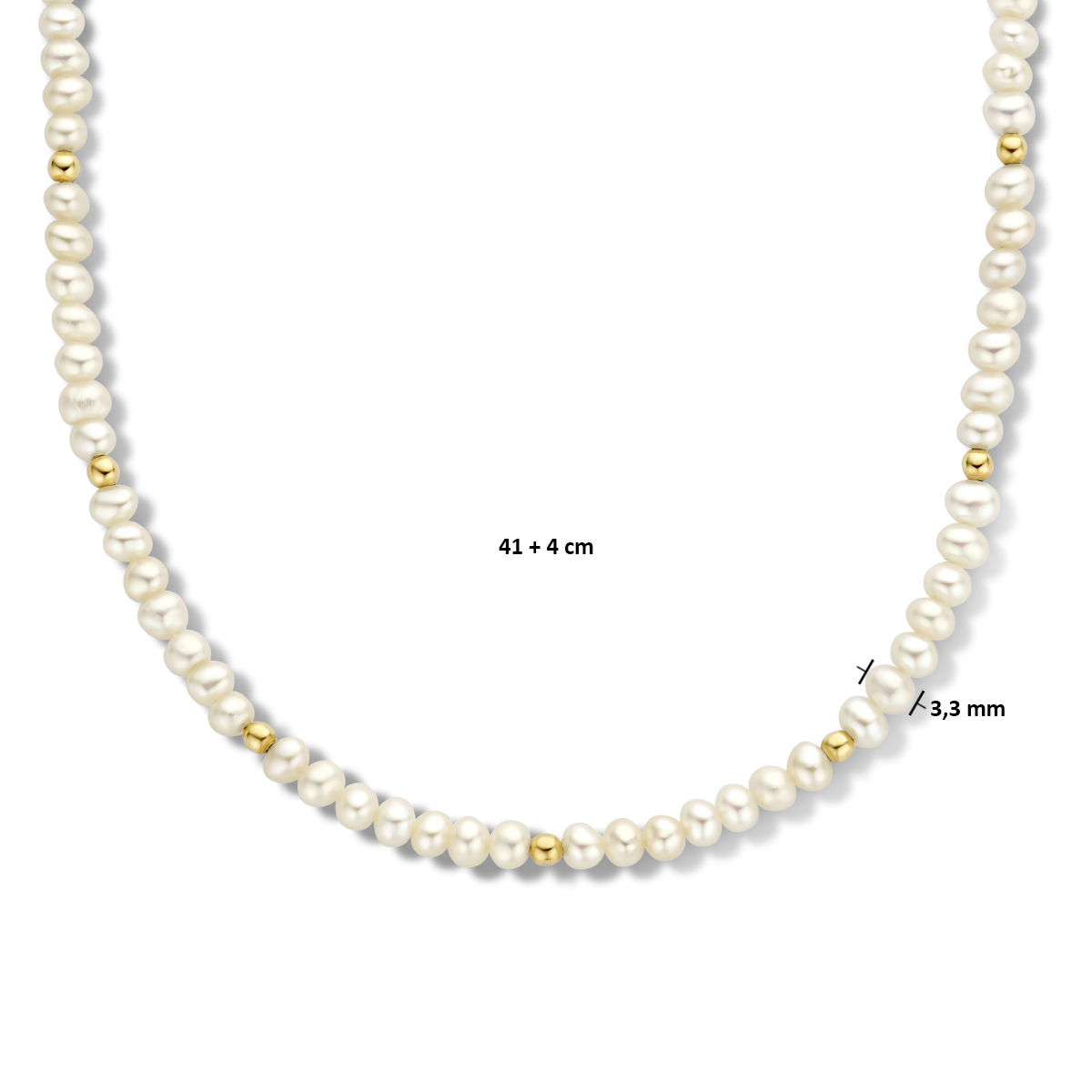 14k Geelgouden collier uitgevoerd met schitterende zoetwaterparels, bolletjes en een karabijnsluiting. Het collier heeft een draaglengte van 41cm en een extensie van 4cm.