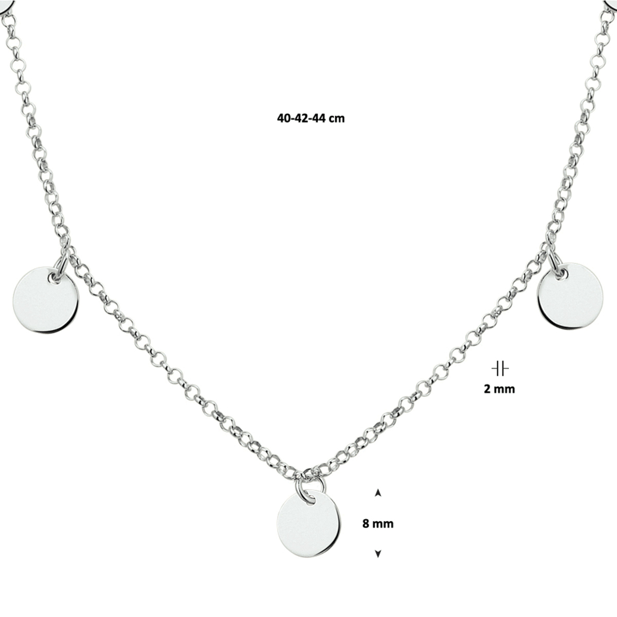 Stijlvol gerhodineerd 925 zilveren Jasseron collier uitgevoerd met ronde hangers met een diameter van 8mm. Het collier heeft draaglengtes van 40, 42 en 44cm. De schakelbreedte is 2mm. Het collier is te combineren met bijpassende sieraden uit onze collectie. INFO: Gerhodineerd zilver is door de rhodiumlaag beter bestand tegen verkleuren en krassen.
