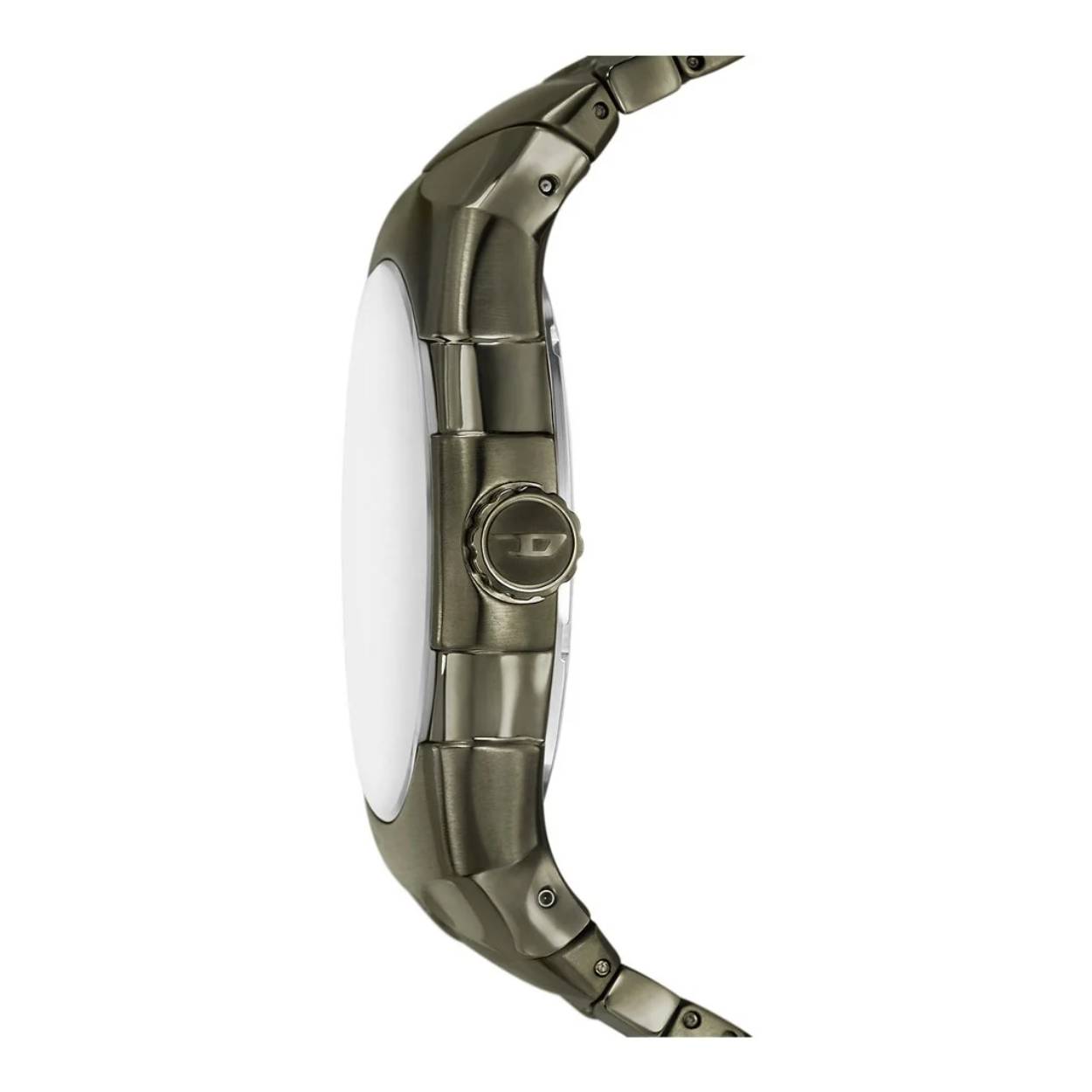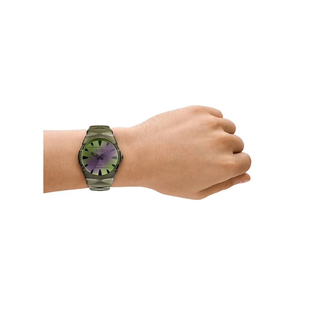 Dit Diesel D-Sruptor horloge van 42mm heeft een zilverkleurige sunray-wijzerplaat, uurwerk met drie wijzers, en een groene roestvrijstalen armband.