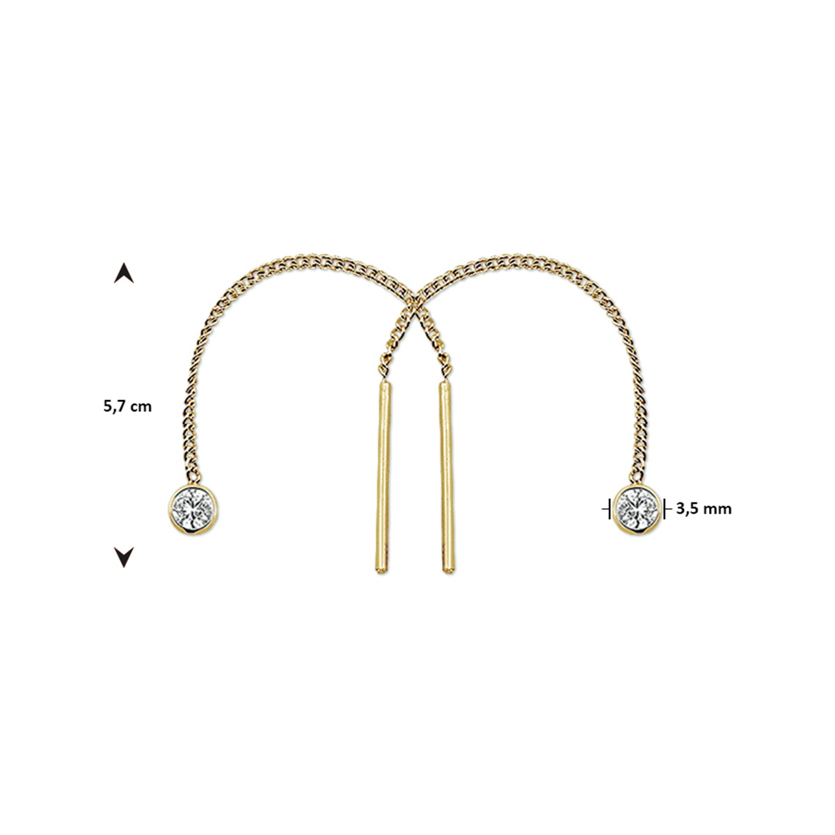 14k Geelgouden doortrekoorbellen uitgevoerd met een schitterende zirkonia. De oorbellen hebben een totale lengte van 5.7cm. De zirkonia heeft een diameter van 3.5mm.