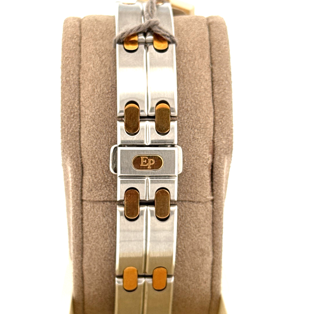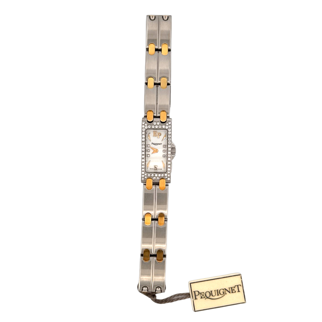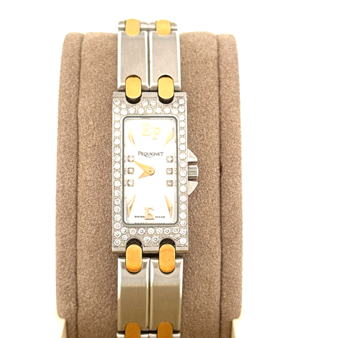 De EP Pequinet 3601419/1 is een luxe polshorloge met een 15 mm kast van roestvrij staal en echt diamanten ontwerp. Het heeft een goud-zilverkleurige band en saffierglas. Het beste te dragen bij formele of chique gelegenheden om een verfijnde stijl uit te stralen.