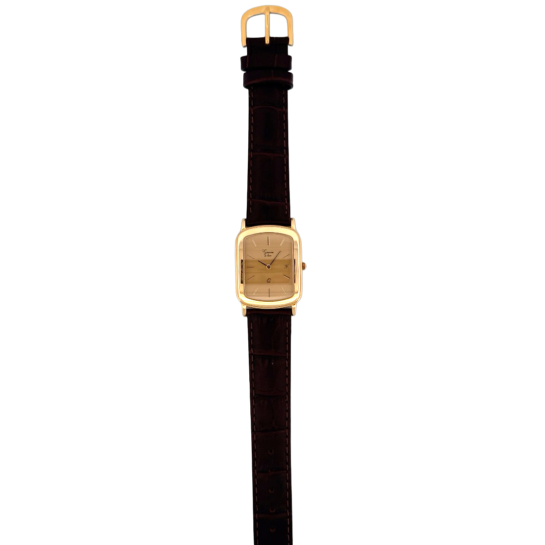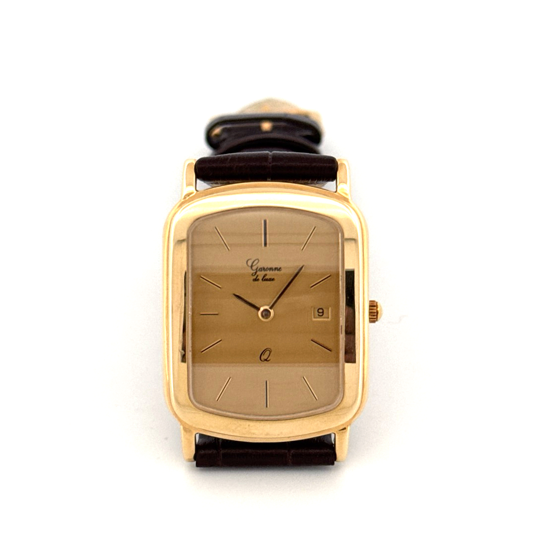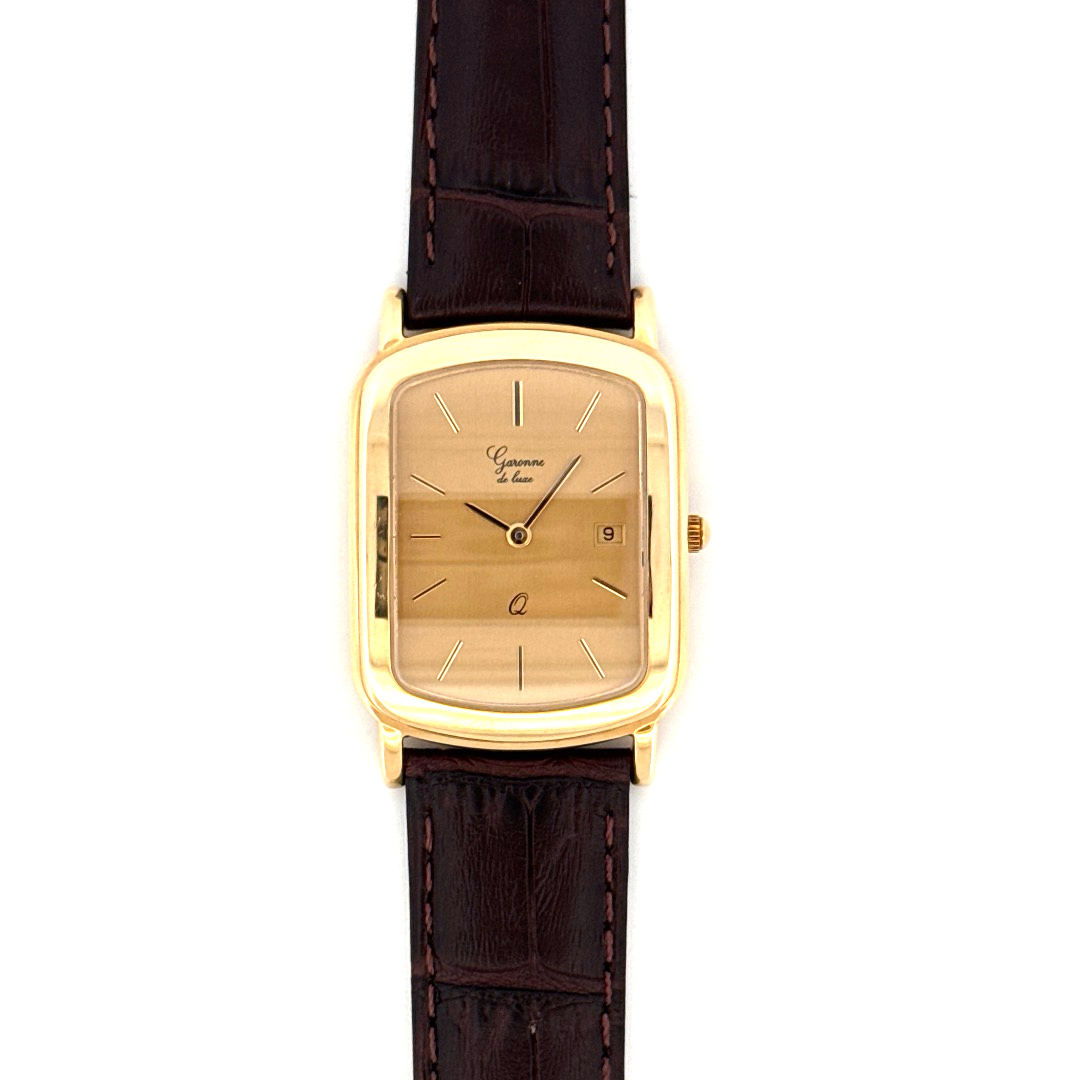 De Garonne de Luxe Horloge 14krt Geelgoud, modelnummer GARONNE 1960WEIS6, is een elegante polshorloge met een gouden rechthoekige kast en een bruin, echt lederen bandje. Het horloge heeft een Zwitserse beweging, datumfunctie, kristallen glas en een gestreept goudkleurig wijzerplaat. Ideaal te dragen bij formele gelegenheden voor een verfijnde uitstraling.