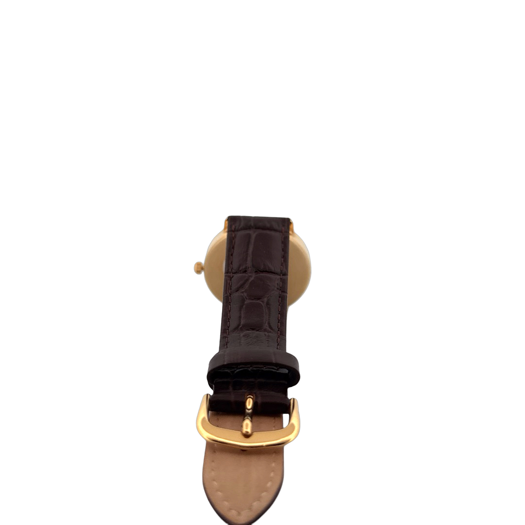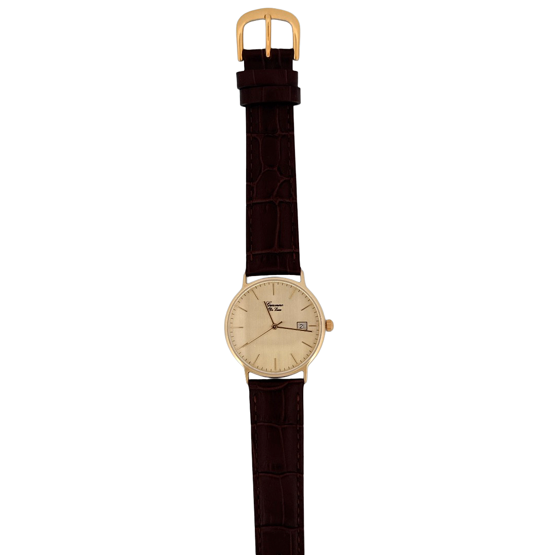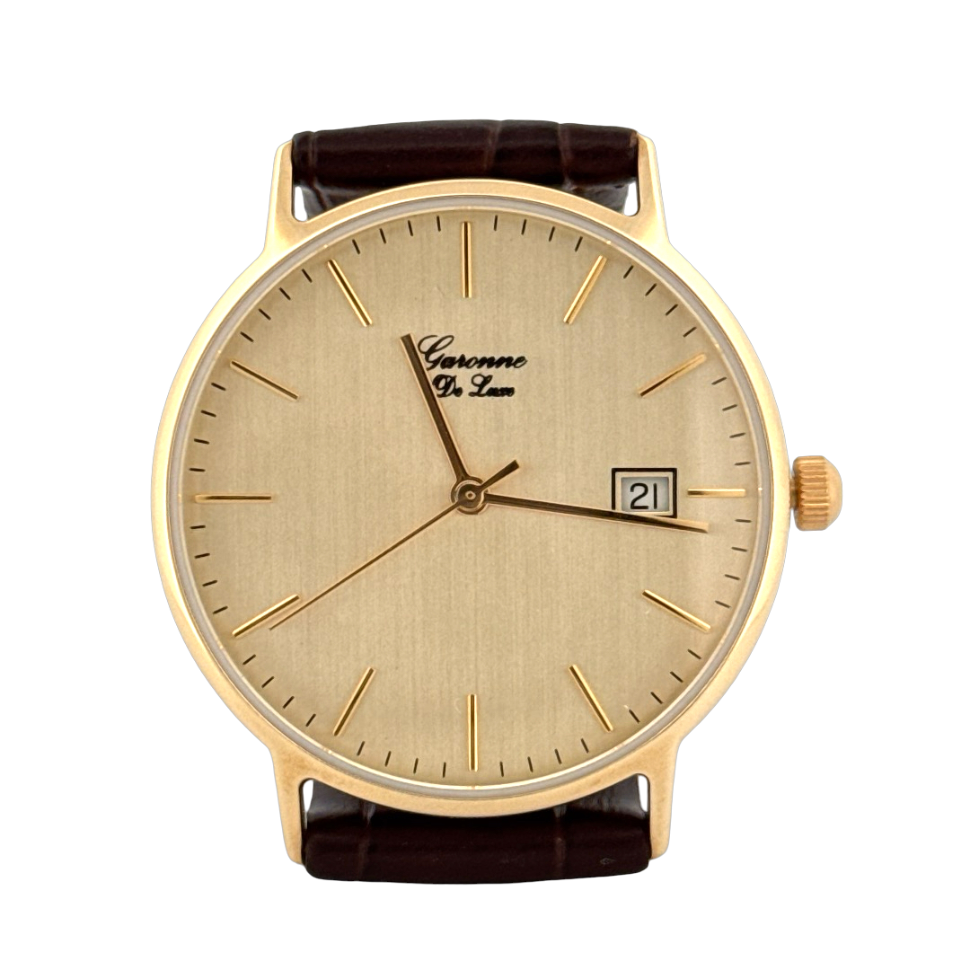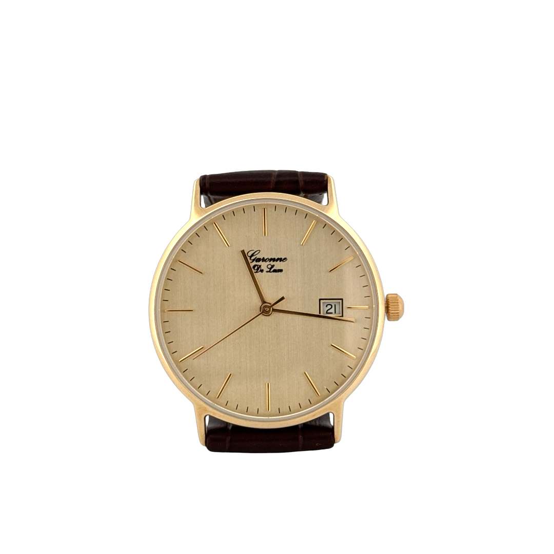 De Garonne de Luxe Horloge 14k geelgoud, combineert elegantie met functionaliteit. Met een gouden kast van 33 mm, bruine lederen band en saffierglas straalt het luxe uit. Uitgerust met een Zwitsers quartz uurwerk en datumaanduiding. Draag deze analoge polshorloge bij formele gelegenheden voor een verfijnde uitstraling.