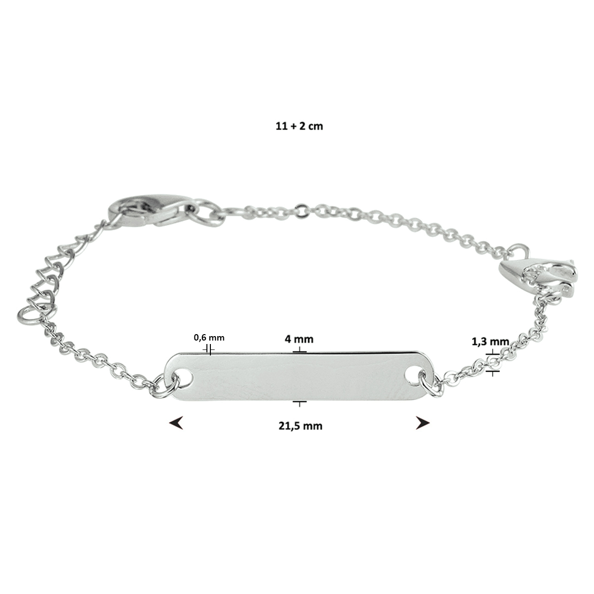 Gerhodineerd zilveren graveerarmband uitgevoerd met een dolfijn bedel met een schitterende rij van zirkonia. De armband heeft een lengte van 11cm en een extensie van 2cm. De schakelbreedte is 1.3mm. Het graveerplaatje heeft een afmeting van 4x21.5mm en de dolfijn heeft een hoogte van 7mm. Info: Gerhodineerd zilver is door de rhodiumlaag beter bestand tegen verkleuren en krassen.