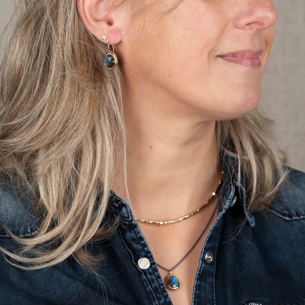 Collier gemaakt van 925 geoxideerd sterling zilver met daaraan een vergulde hanger met de edelsteen Labradoriet. Combineer met de bijpassende oorbellen voor een complete look!