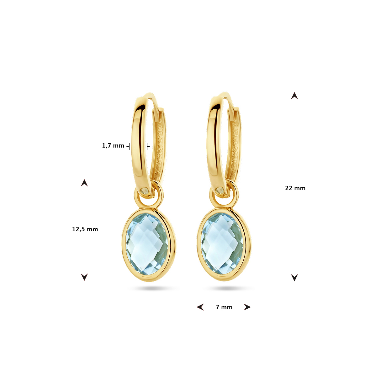14k Geelgouden klapoorringen uitgevoerd met blauw topaas. De oorringen hebben een totale hoogte van 22mm.