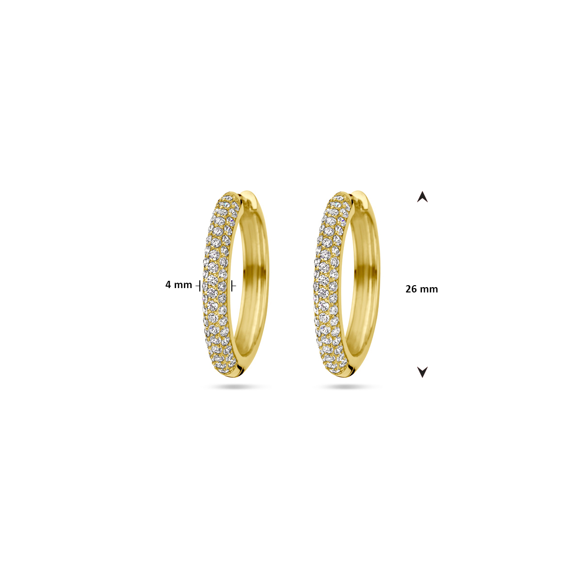 Geelgoud op 925 zilveren klapoorringen uitgevoerd met zirkonia. De klapoorringen hebben een afmeting van 26x4mm. Geen garantie op de plating.