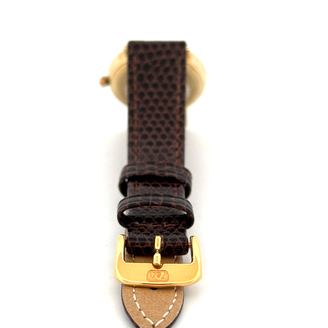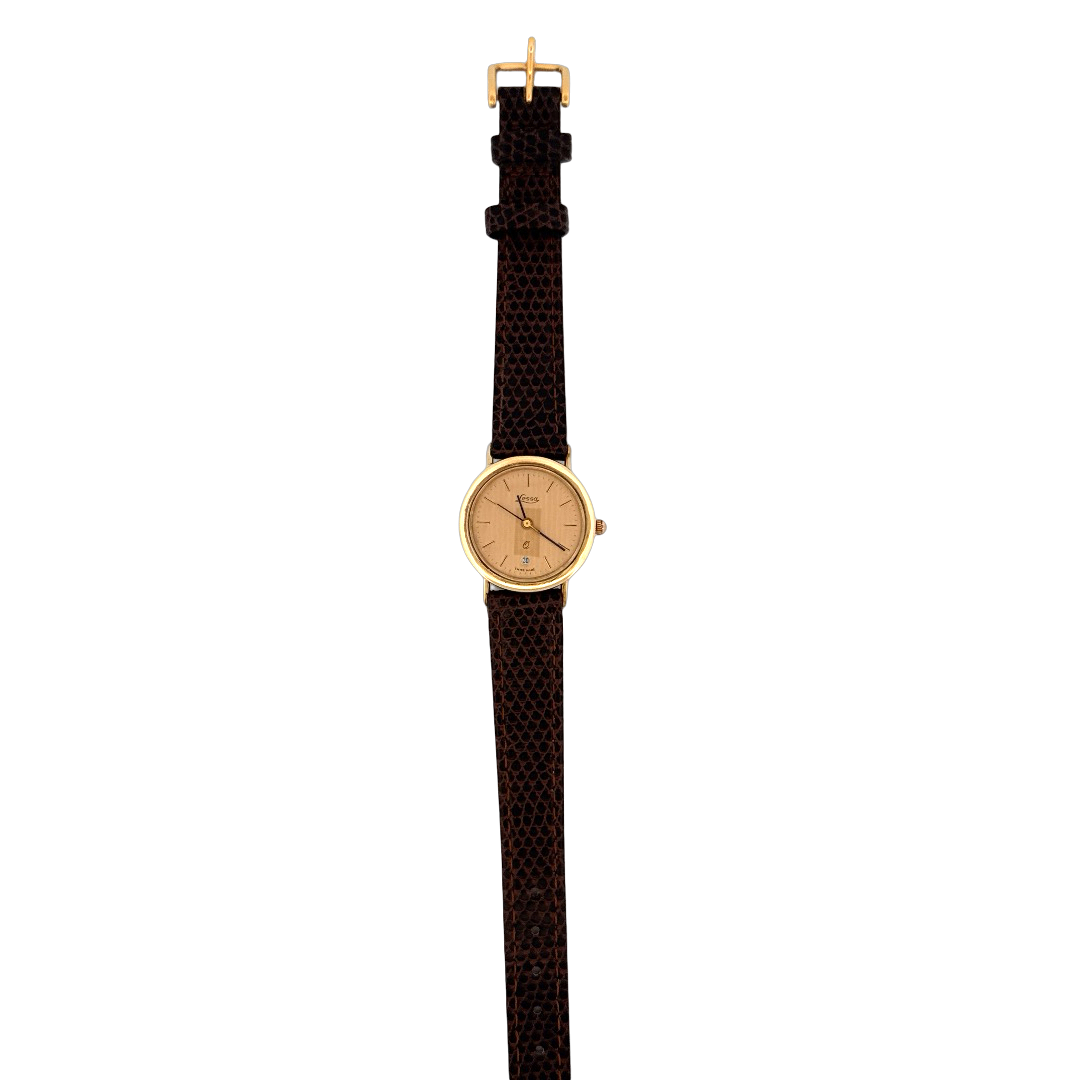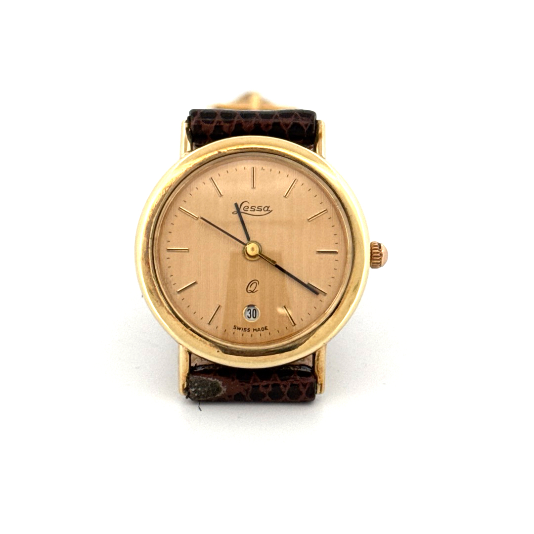 De Lessa Horloge 14krt Geelgoud, is een verfijnd polshorloge met Zwitserse quartzbeweging. Het heeft een ronde, gouden kast van 26 mm, gouden wijzerplaat met strepen, en bruine leren band. Zonder datumfunctie, maar met analoge aanduiding. Perfect voor formele gelegenheden of dagelijks gebruik voor een stijlvolle uitstraling.