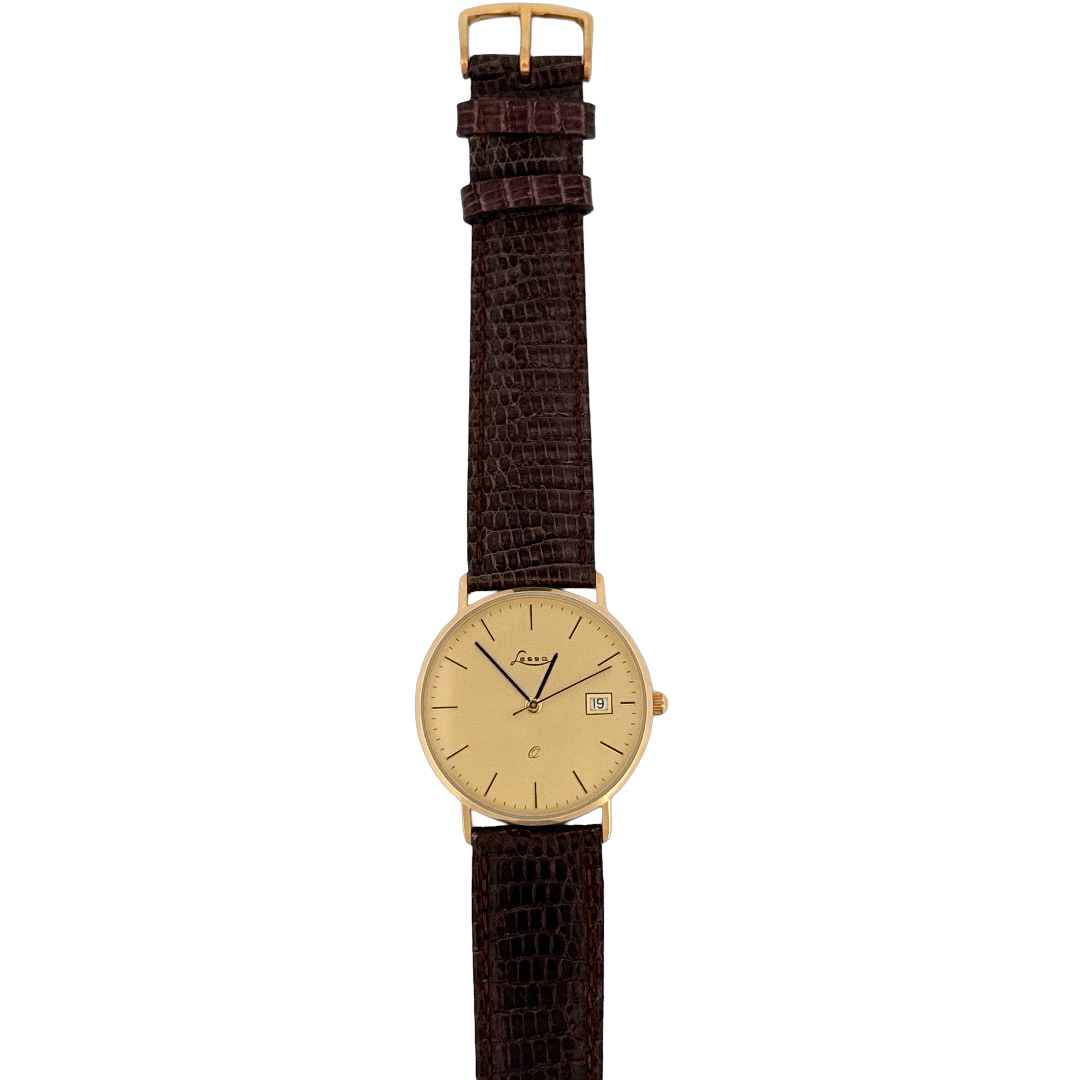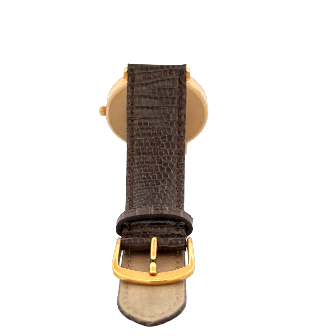 De Lessa Horloge 14krt Geelgoud 55GL is een elegante dameshorloge met een gouden ronde kast van saffierglas, een bruine lederen band, en analoge Zwitserse quartz uurwerk. Voorzien van een datumfunctie en gestreepte wijzerplaat. Ideaal voor zowel formele als casual gelegenheden. Draag het met gouden sieraden voor een verfijnde uitstraling.