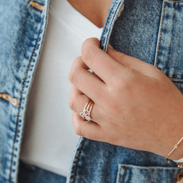 Kies een edelsteen die een belangrijk moment symboliseert—geboorte, jubileum of een andere mijlpaal—en laat ‘m extra stralen dankzij de halo van diamantjes.