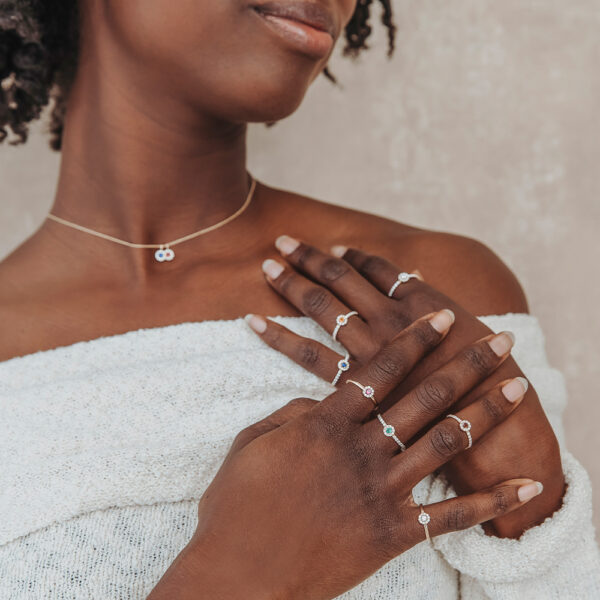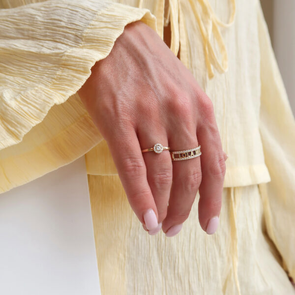 Ontwerp je eigen Minioro Milestone Ring Halo, een aanschuifbare ring van 14-karaats goud met jouw speciale edelsteen in het hart, omlijst door een Halo van pavé gezette diamanten.