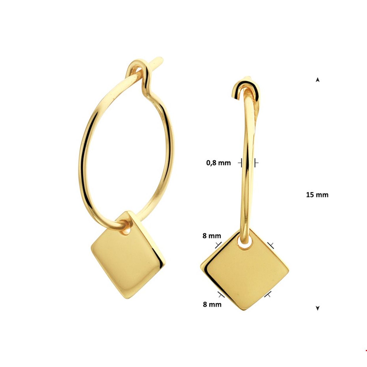 Beschrijving: Geelgoud op zilveren oorringen met een afmeting van 15x0.8mm uitgevoerd met een poli afgewerkt vierkantje van 8x8mm.