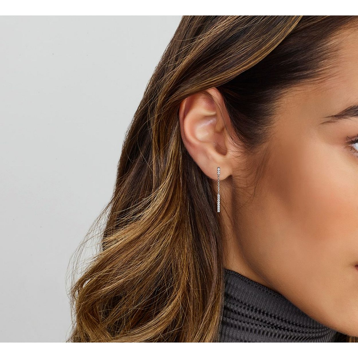 14k Witgouden oorhangers uitgevoerd met een schitterende diamant rij. De oorhangers hebben een totale hoogte van 2.5cm en een breedte van 1.4mm.