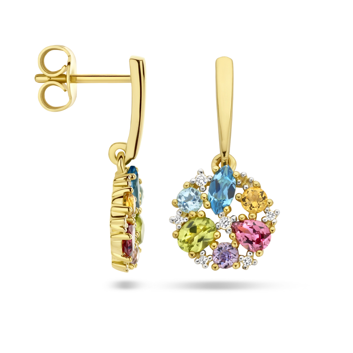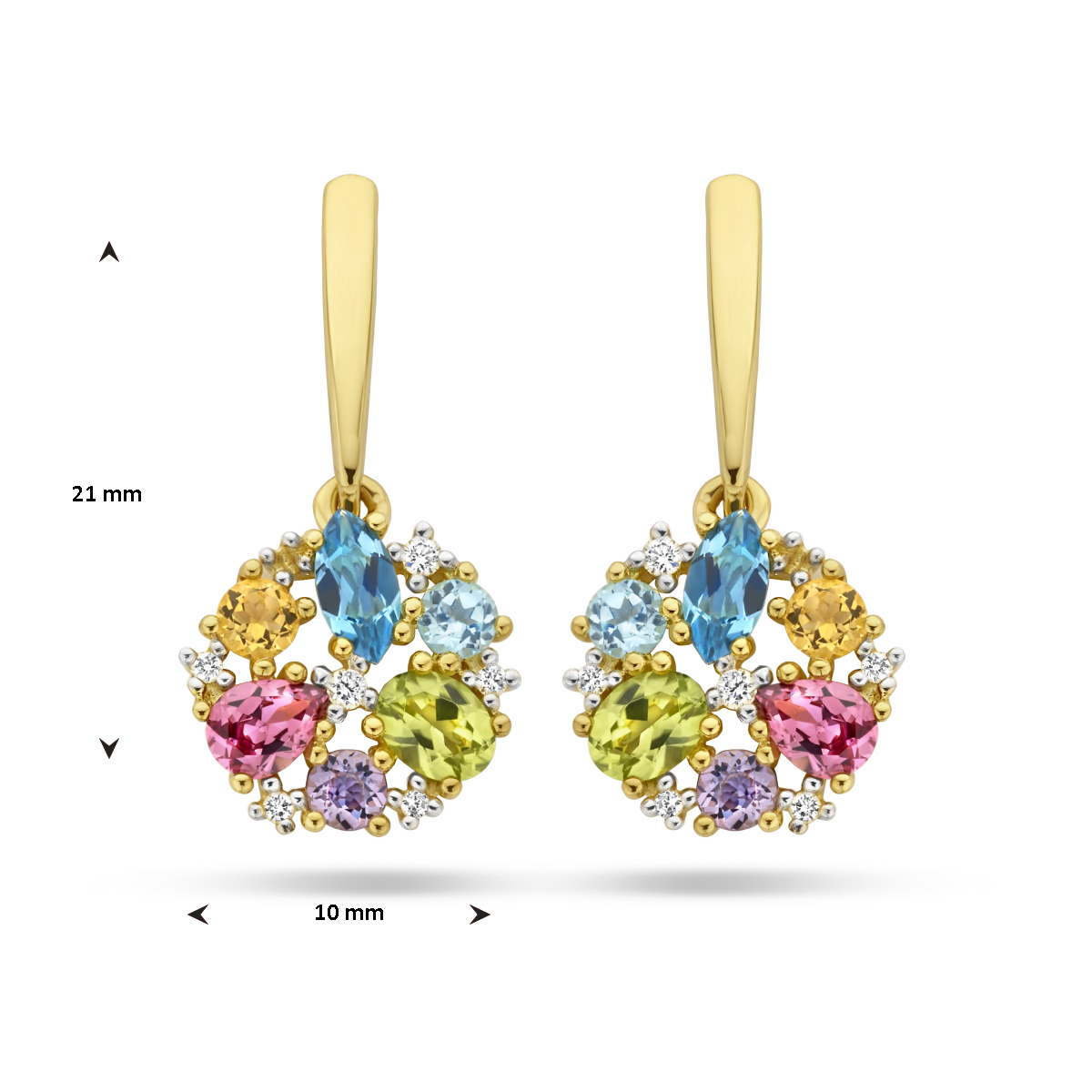 14k Geelgouden oorhangers uitgevoerd met schitterende edelstenen en diamant. De oorhangers hebben een totale hoogte van 21mm. De stenen zijn: amethist, London blue topaas, peridot, roze rhodoliet, citrien.