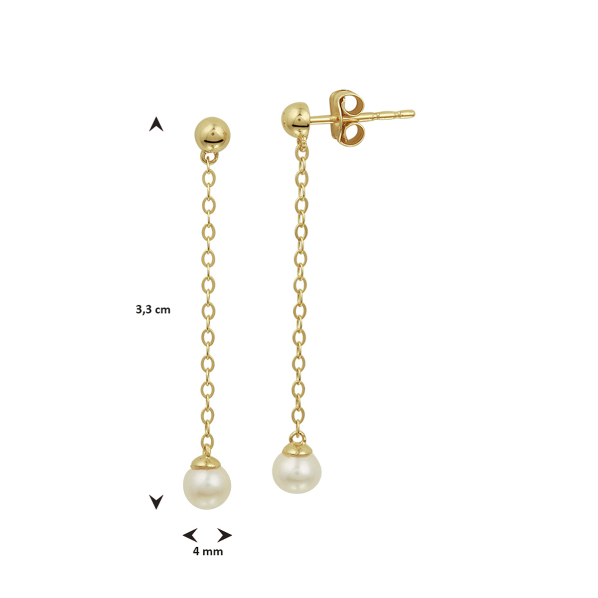 Geelgouden oorhangers met een anker schakel van 3.3cm uitgevoerd met een zoetwaterparel van 4mm en stevige poussette sluiting. Tip: Combineer de oorhangers met zoetwaterparel sieraden uit onze collectie en maak zo een mooie set!.