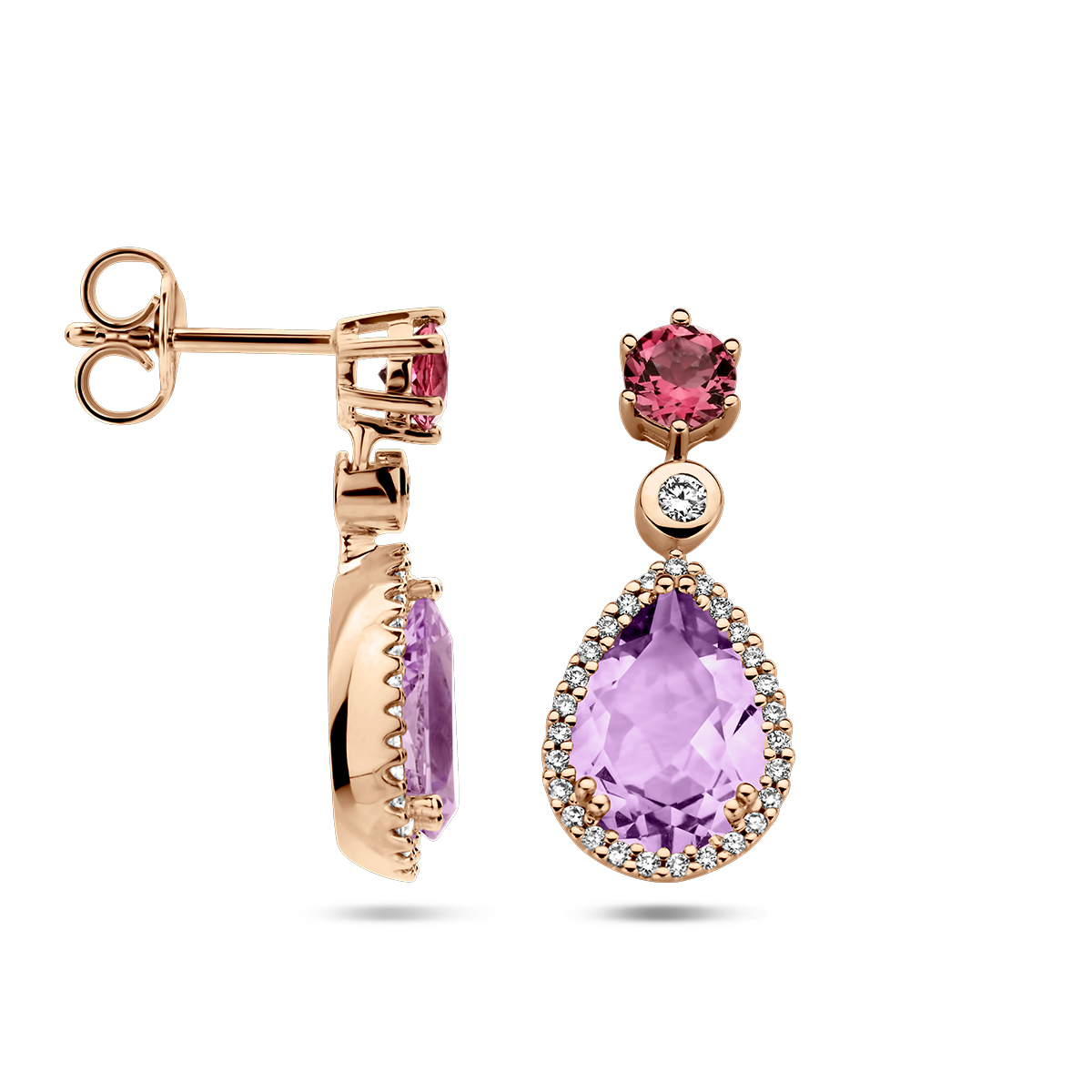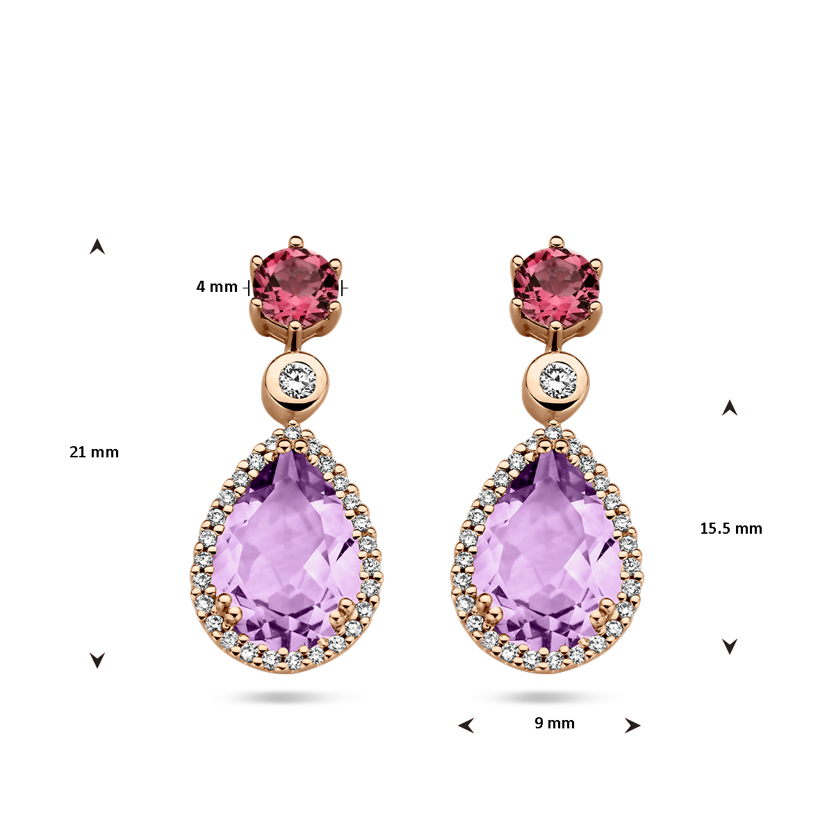 14k Rosegouden oorhangers uitgevoerd met rhodoliet, amethist en diamanten. De oorhangers hebben een totale hoogte van 21mm.