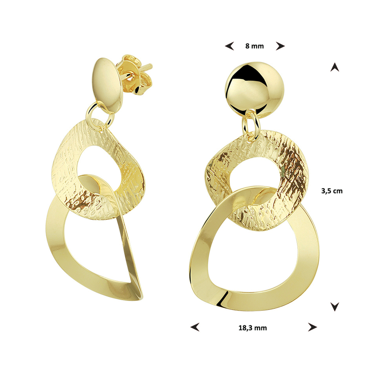 Geelgoud op 925 zilveren oorhangers uitgevoerd met twee rondjes. De oorhangers hebben een totale hoogte van 35mm. Geen garantie op plating.