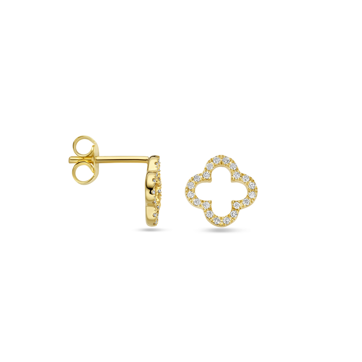 14k Geelgouden oorknoppen uitgevoerd in de vorm van een klavertje met diamant. De oorknoppen hebben een diameter van 9mm. Het totale diamantgewicht is 0.12ct.