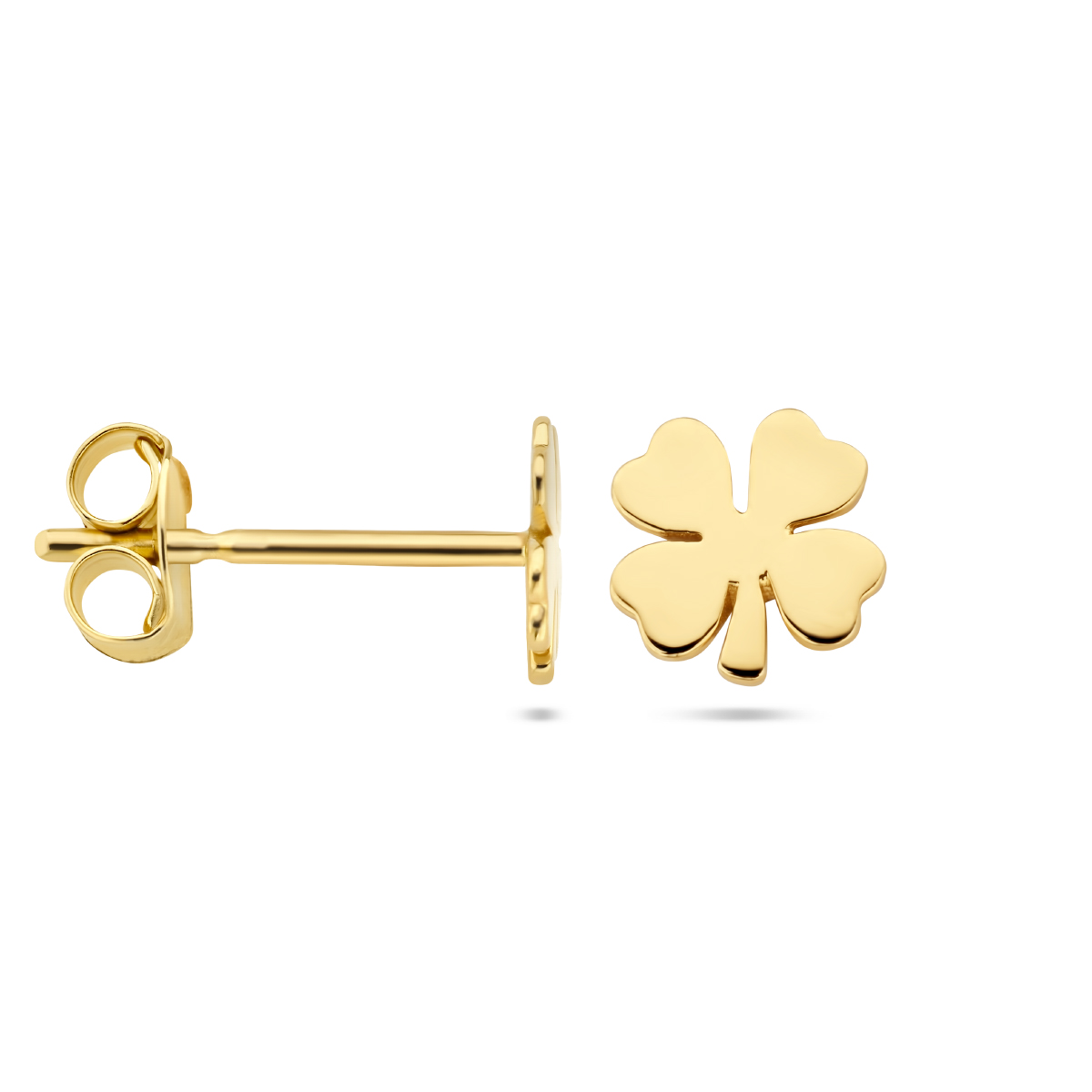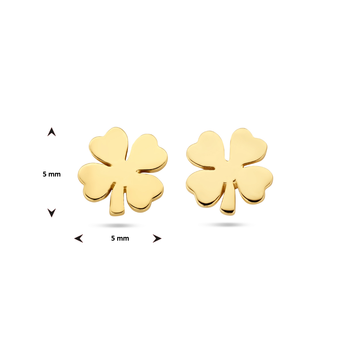 14k Geelgouden klavertjes oorknoppen met een afmeting van maat 5x5mm.