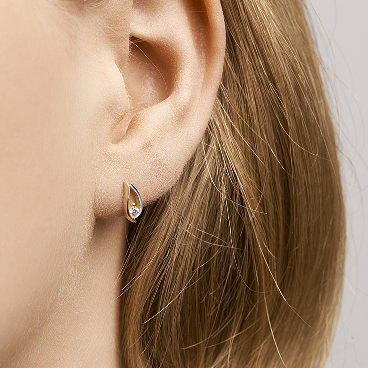 Beschrijving: Deze oorsteker van 14k geel- en witgoud heeft een elegant ontwerp. Ingespannen tussen de twee soorten goud is een transparante zirkonia steen. De hoogte van de oorsteker is 9mm, de breedte is 4,5 mm.