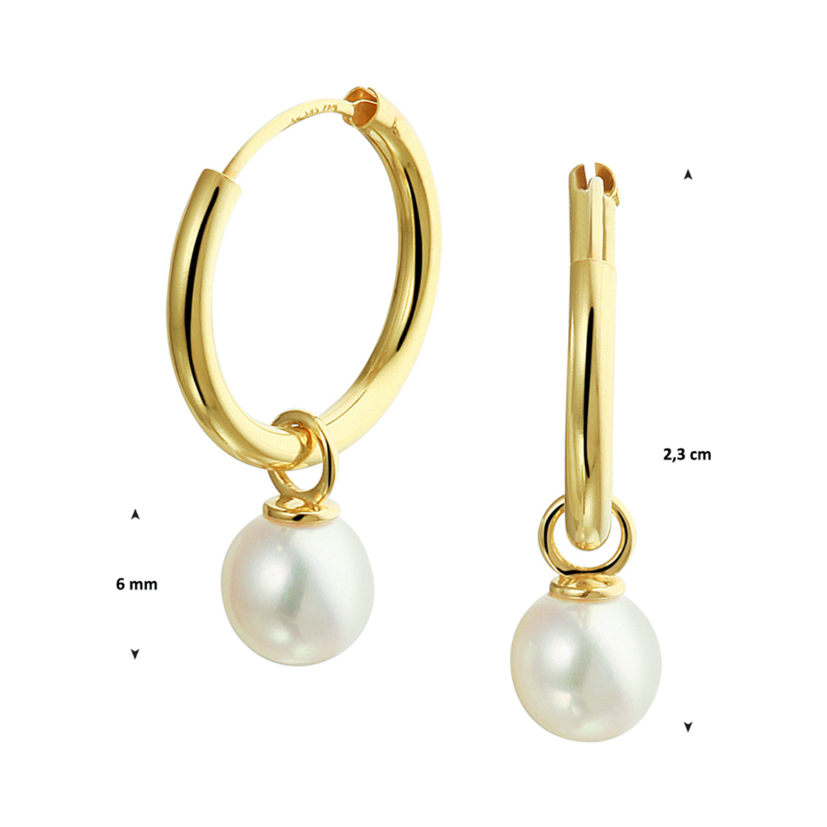 Beschrijving: Trendy geelgouden creolen met een schitterende zoetwaterparel. De creolen hebben een afmeting van 17x1.8mm met een parel van 6mm. Tip: Leuk om kado te geven! De creolen hebben een subtiele uitstraling en kunnen dagelijks gedragen worden.