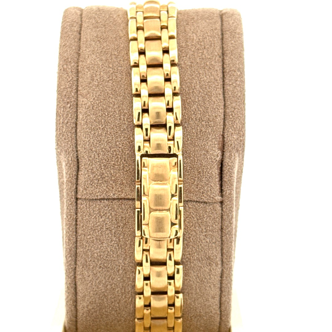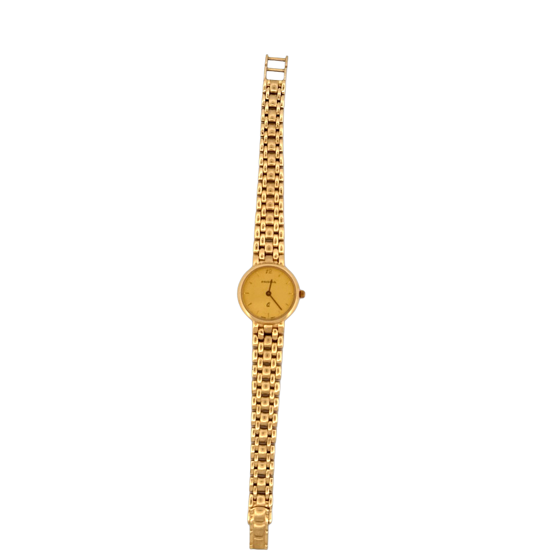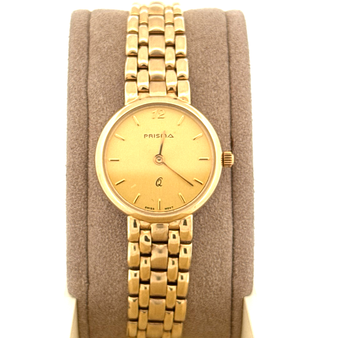 De Prisma Horloge 14krt Geelgoud A325302 is een elegante damespolshorloge met een gouden kast en band van massief goud. Het beschikt over een Zwitsers quartz uurwerk, analoge wijzerplaat met strepen, saffierglas en een diameter van 24 mm. Perfect voor formele gelegenheden, voeg een vleugje luxe toe aan elke outfit.