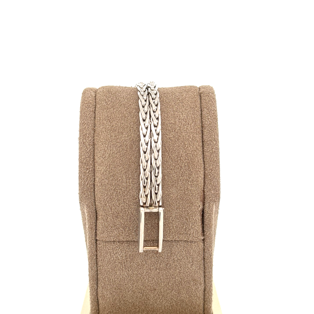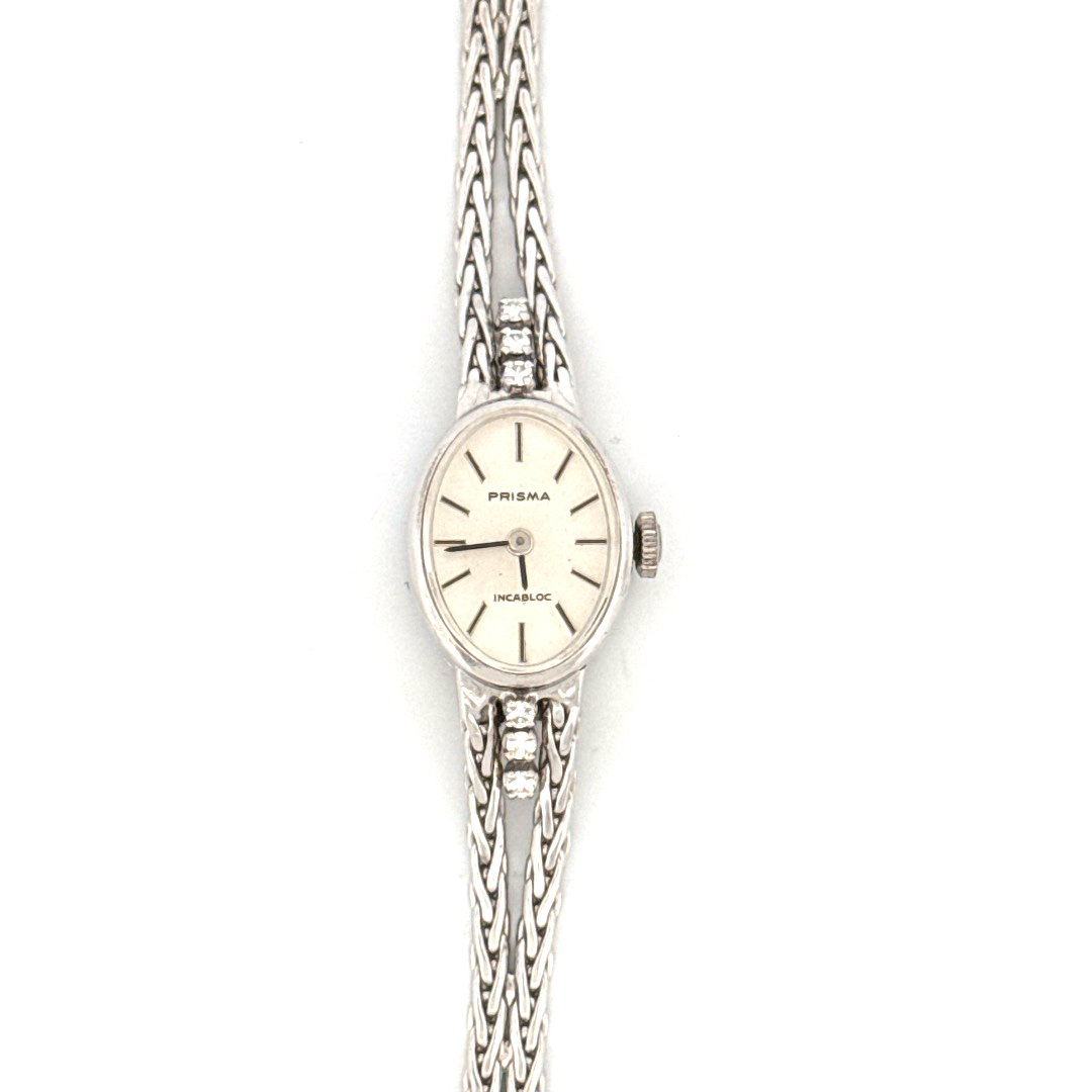 De Prisma Horloge 14krt Witgoud met Briljanten is een luxe horloge met een zilverkleurige 14-karaats gouden horlogeband en kast. Het beschikt niet over een datumaanduiding. Draag dit verfijnde horloge tijdens formele gelegenheden of combineer het met elegante, chique outfits voor een verfijnde uitstraling. Perfect voor degenen die houden van tijdloze luxe.