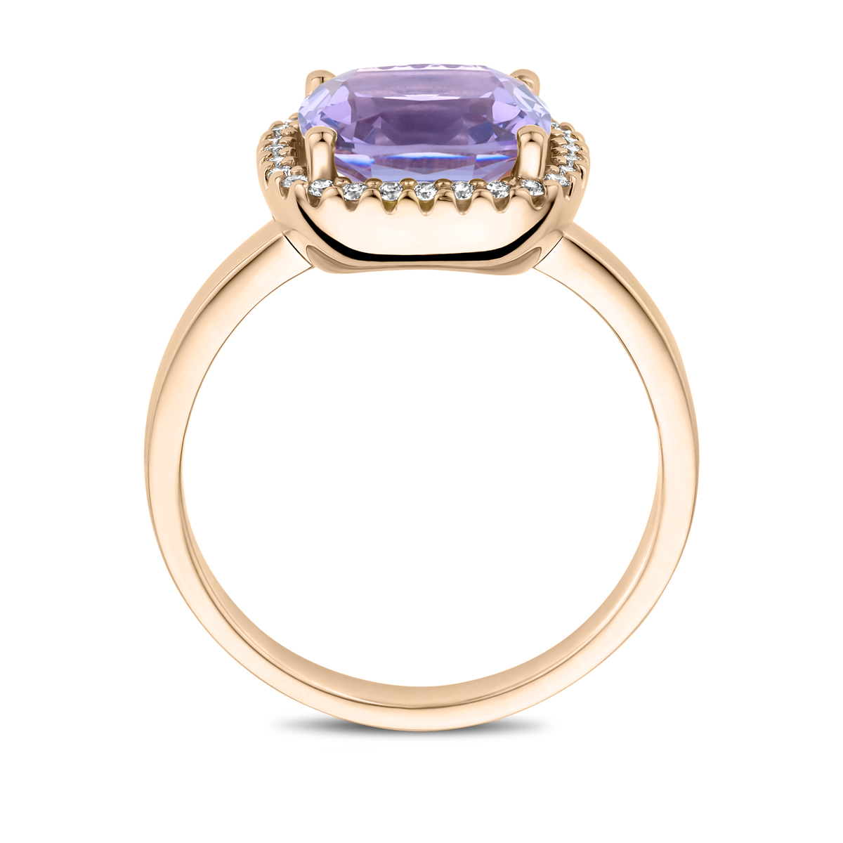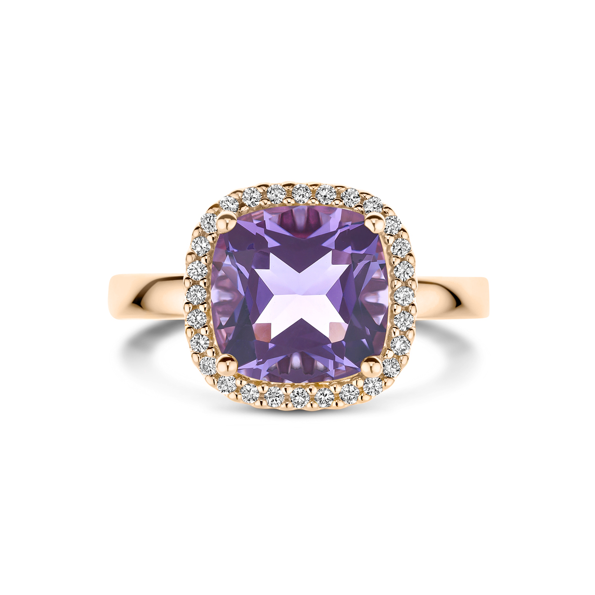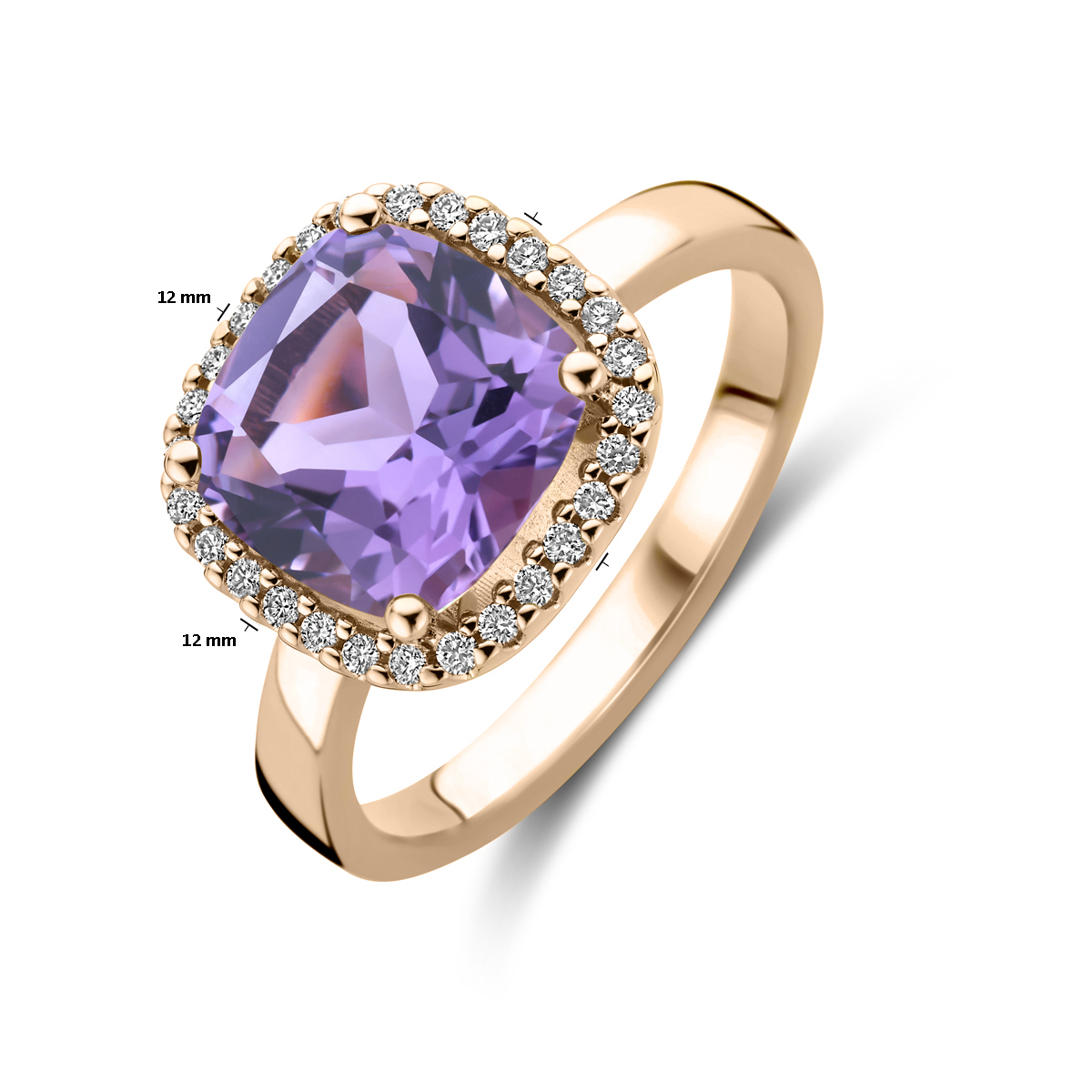 Deze prachtige rosegouden ring is versierd met een schitterende amethist en 0.14 karaat diamanten van hoge kwaliteit (SI). De ring is subtiel en elegant, perfect voor dagelijks gebruik of een speciale gelegenheid. Combineer deze ring met andere rosegouden sieraden voor een complete en stijlvolle look. Een tijdloos accessoire dat elke outfit compleet maakt. Bestel nu en straal!