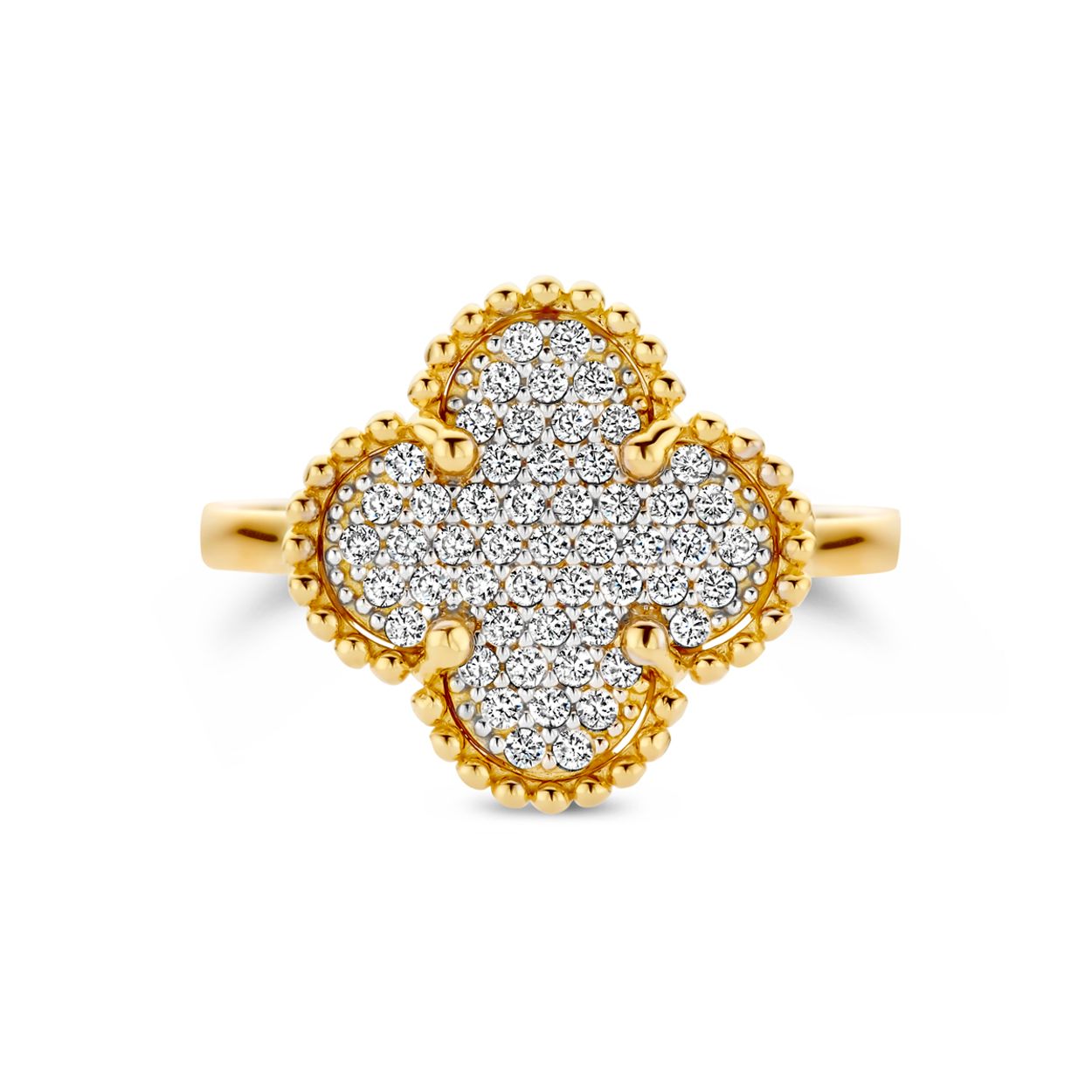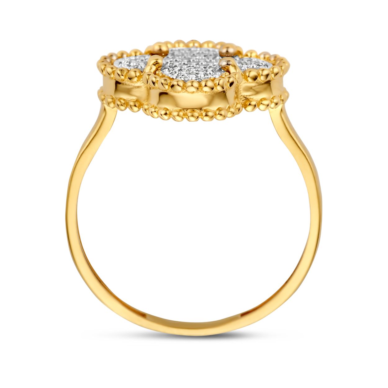 14k Geelgouden ring uitgevoerd met zirkonia. De ring heeft een breedte van 14mm.