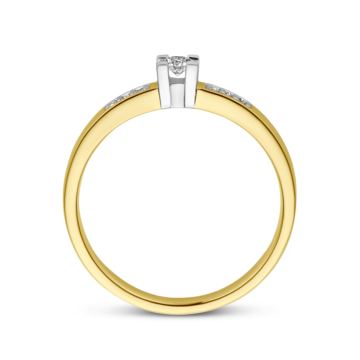 Bicolor geel en witgouden ring van 3.5mm breed uitgevoerd met een rijzetting van briljant geslepen diamant van 0.08ct.
